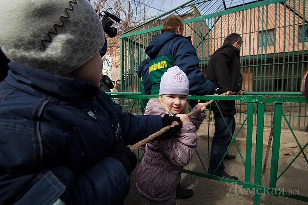 А кульминацией праздника стало перетягивание каната с настоящим львом, а точнее 6-летней львицей Симой. Более тридцати детей сумели дважды победить Симу, за что получили призы от администрации зоопарка — кошачьи маски, открытки и многое другое. По словам замдиректора зоопарка Игоря Белякова, львицам очень нравиться, когда с ними играют, в том числе и в перетягивание канатов. Интересно, что накануне работники зоопарка репетировали со своими питомцами и тогда побеждали львы. Игорь Беляков добавил, что еще одним поводом для празднования в зоопарке можно считать начало «бэби-бума» — недавно родившейся детеныш муфлона уже самостоятельно бегает в вольере со стадом.