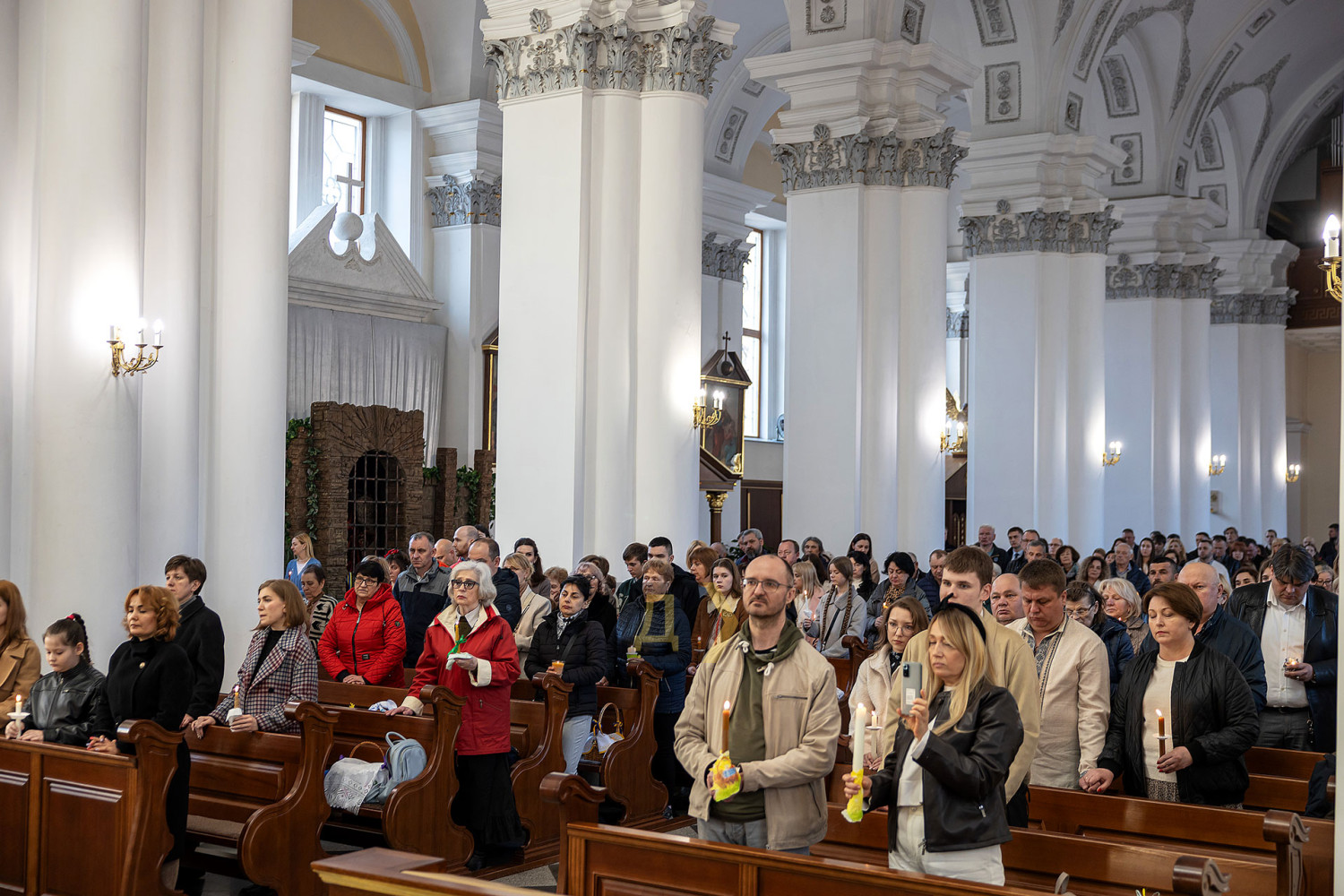 Богослужение собрало сотни прихожан. Пред входом в храм традиционно установили огромный каркас в виде яйца, куда каждый может повесить свою писанку.