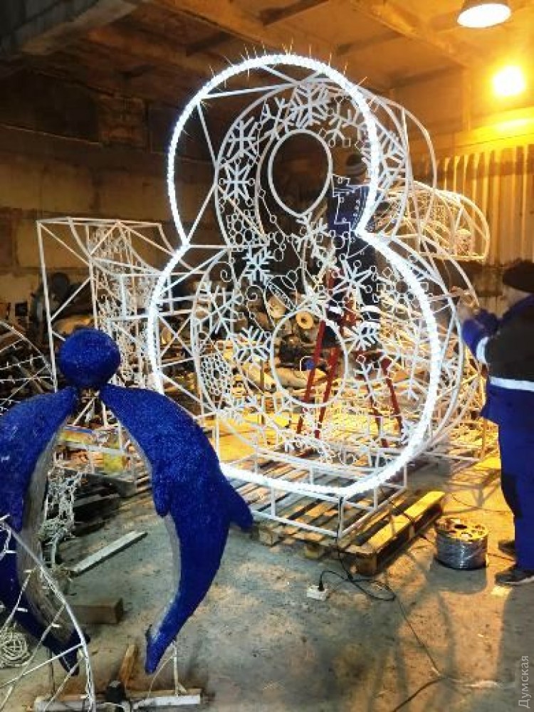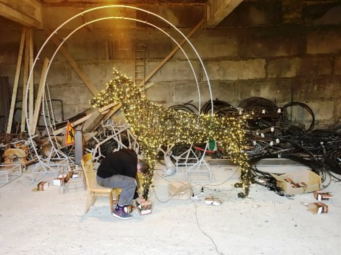В преддверии новогодних праздников специалисты коммунального предприятия «Одесгорсвет» в своих мастерских обновляют старые и создают новые светящиеся фигуры для сказочного городка животных, который традиционно установят на Думской площади.