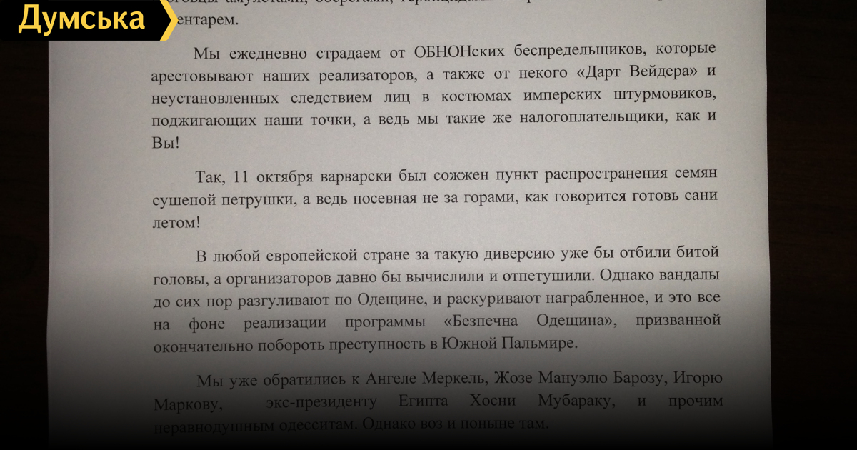 Одесские торговцы курительными смесями обратились к президенту с просьбой защитить их бизнесОдесские торговцы курительными смесями обратились к Президенту Украины, Генеральному прокурору Украины, главе Службы безопасности Украины, прокурору Одесской области, лидеру Евразийской революции Игорю Маркову с просьбой защитить их от беспредела ОБНОНа, Дарт Вейдера, и дать им возможность нормально работать и платить налоги. В качестве демонстрации своей лояльности к власти наркоторговцы положили в каждое письмо пакетик с курительной смесью 0,3г — чтобы в высоких кабинетах наконец-то поняли, что это еще никому не вредило. Эти фотографии торговцы зельем разместили в социальных сети в своей группе. Одесская челобитная! Уважаемый президент, презентуем Вам образцы экологически чистой продукции в надежде на вашу защиту и покровительство. Мы - честные одесские предприниматели, оптовые торговцы амулетами, оберегами, гербицидами и прочим садово-огородным инвентарем. Мы ежедневно страдаем от ОБНОНских беспредельщиков, которые арестовывают наших реализаторов, а также от некого «Дарт Вейдера» и неустановленных следствием лиц в костюмах имперских штурмовиков, поджигающих наши точки, а ведь мы такие же налогоплательщики, как и Вы! Так, 11 октября варварски был сожжен пункт распространения семян сушеной петрушки, а ведь посевная не за горами, как говорится готовь сани летом! В любой европейской стране за такую диверсию уже бы отбили битой головы, а организаторов давно бы вычислили и отпетушили. Однако вандалы до сих пор разгуливают по Одещине, и раскуривают награбленное, и это все на фоне реализации программы «Безпечна Одещина», призванной окончательно побороть преступность в Южной Пальмире. Мы уже обратились к Ангеле Меркель, Жозе Мануэлю Барозу, Игорю Маркову, экс-президенту Египта Хосни Мубараку, и прочим неравнодушным одесситам. Однако воз и поныне там. Виктор Федорович, протяните руку помощи, а мы найдем, что вложить в протянутую руку. Надеемся на Вас, как на Донбас! P.S. В знак начала плодотворной работы, просим принять от нас маленький, но очень ценный подарок ( 60 грн.), надеемся что он станет фундаментом наших отношений и долгосрочного партнерства! «Наркоторговцы уверены в своей безнаказанности и этой акцией они демонстрируют свою силу. С другой стороны, ни одно дело по закрытию притонов в Одессе не доведено до суда. Наверное, они действительно обладают иммунитетом от уголовного преследования, что могут себе позволить рассылать наркотики в конвертах. Даже в банановых республиках открыто продавать наркотики запрещено, а в европейской Украине это можно делать в центре города», — заявил лидер Интернет партии Украины Дмитрий Голубов. СМЕРТЬ РОСІЙСЬКИМ ОКУПАНТАМ! Помітили помилку? Виділяйте слова з помилкою та натискайте control-enter Новини по цій темі: 15 серпня 2019: Антиньюз: уголовные дела Порошенко, соревнования водителей автозаков в РФ и жадный Алеша (видео) 13 липня 2019: Зеленский собирался устроить пробежку по Трассе здоровья, но его остановил Дарт Вейдер со штурмовиками 25 червня 2019: Новые мажоритарщики Одесской области: Дарт Вейдер, директор "Думской", владелец "Виртуса", Князь и мэр Болграда 14 листопада 2018: В Одессе судили Дарта Вейдера |