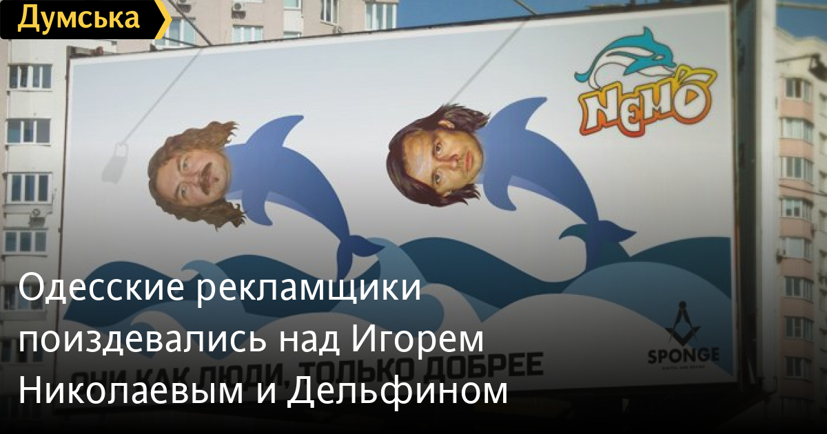 Сотрудники одесского рекламного агентства Sponge Digital разработали креативную рекламу для дельфинария. «Говорят, что дельфины лечат от многих болезней, в том числе и от психических расстройств. Мы любим этих добродушных животных, и поэтому совершенно бесплатно разработали концептуальную веселую рекламу», — цитирует представителя фирмы сайт «Вгороде». Креативщики прицепили к фигурам дельфинов головы певцов Игоря Николаева («Дельфин и русалка») и Андрея Лысикова (Дельфин). Слоган кампании «Они как люди, только добрее». Рекламщики уверяют, что артисты совсем не против фигурировать в рекламе. «Игорь дал добро, недавно в этом самом дельфинарии выступал в резиновой шапочке, а Андрею все равно, он на депрессе», — написал представитель агентства. Креативщики обещают, что в скором времени их творение можно будет увидеть на улицах города. СМЕРТЬ РОССИЙСКИМ ОККУПАНТАМ! Заметили ошибку? Выделяйте слова с ошибкой и нажимайте control-enter |