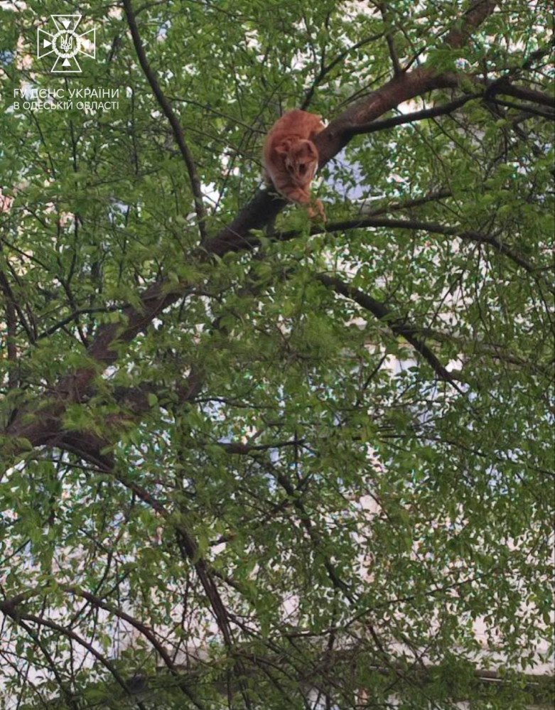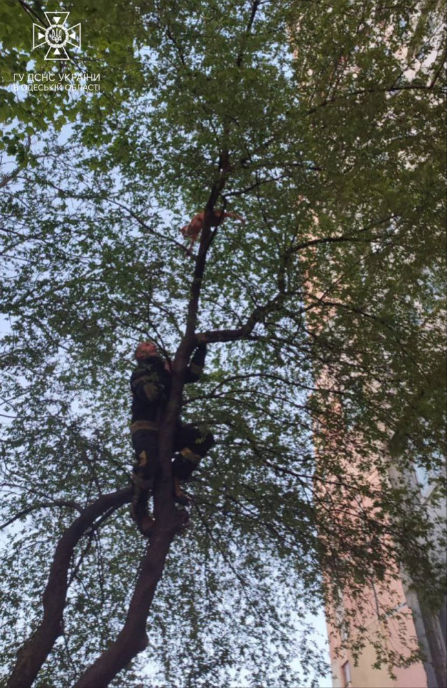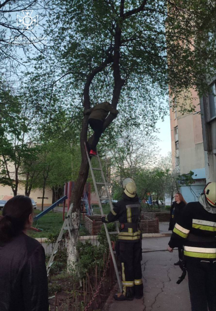 Кота і його господарку, які не могли самостійно спуститися з дерева, врятували співробітники ДСНС в Одеській області ввечері 1 травня.