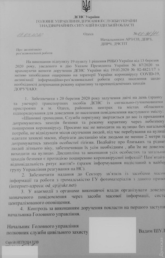 С завтрашнего дня по улицам Одессы будут ездить автомобили-громкоговорители и сообщать населению о необходимости придерживаться мер безопасности и соблюдать режим карантина. Соответствующий приказ подписал начальник главного управления ГСЧС в Одесской области Вадим Шуляк. Одесситов будут просить не выходить на улицу без необходимости, не посещать места скопления людей, а во время пребывания на улице надевать защитные маски и сохранять дистанцию между людьми не менее двух метров. Спасатели планируют объезжать город с оповещениями утром и вечером. Такие же меры будут приняты в районных центрах и городах областного подчинения. Отметим, что призывать к соблюдению карантина таким образом будут во всех городах Украины. СМЕРТЬ РОСІЙСЬКИМ ОКУПАНТАМ! Помітили помилку? Виділяйте слова з помилкою та натискайте control-enter Новини по цій темі: 4 березня 2023: "Вакцини-довгожителі", або Як щеплення проти COVID-19 перетворилися в Україні на небезпечний ритуал 27 січня 2023: МОЗ зобов`язали опублікувати договори на закупівлю вакцин проти COVID-19: апеляційний суд задовольнив позов журналіста "Думської" 11 січня 2023: За тиждень в Одесі зафіксовано 159 випадків ковіду 4 січня 2023: За тиждень в Одесі зареєстровано 113 випадків ковіду |