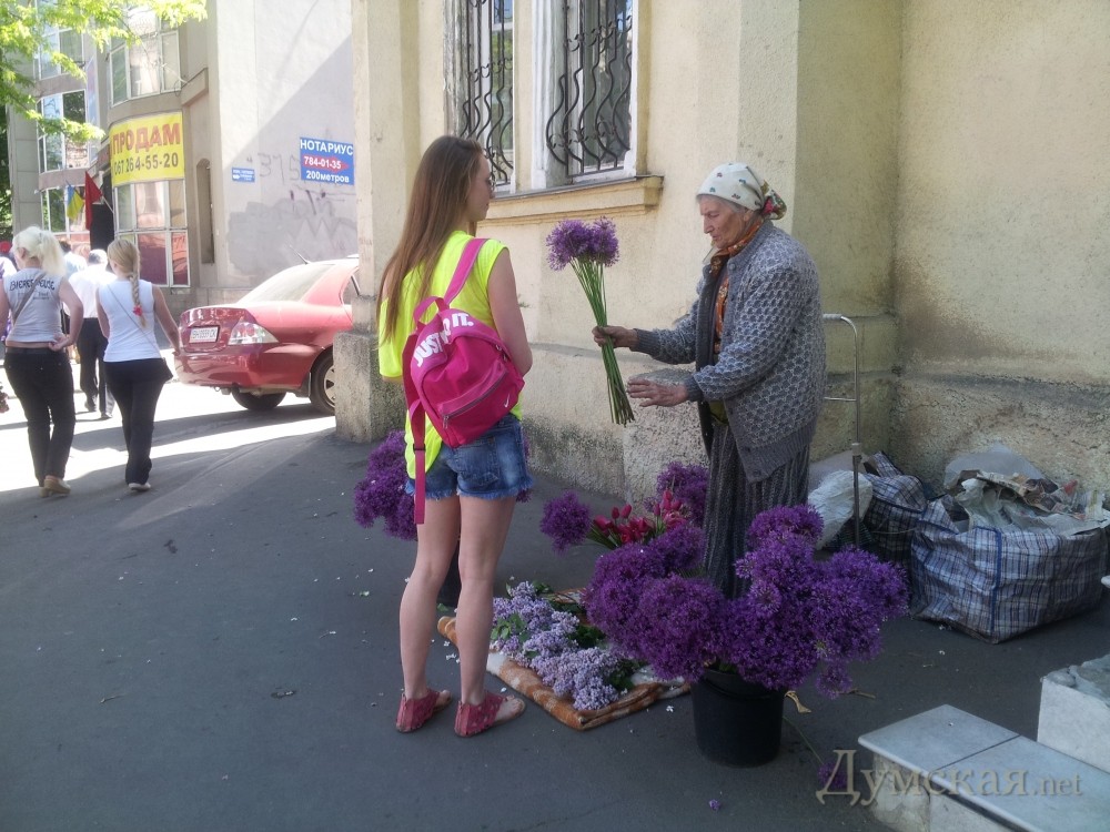 Одесские торговцы цветами смекнули, что хорошо заработать можно не только 14 февраля и 8 марта. День Победы — тоже неплохая возможность сбыть побольше товара. Торгуют цветами сегодня у каждого памятника, посвященного войне, ее жертвам и героям. Больше всего торговых точек наблюдается у парка Шевченко. На Лидерсовском бульваре, как передает ваш корреспондент, образовалась настоящая цветочная ярмарка.