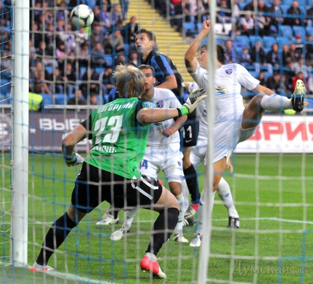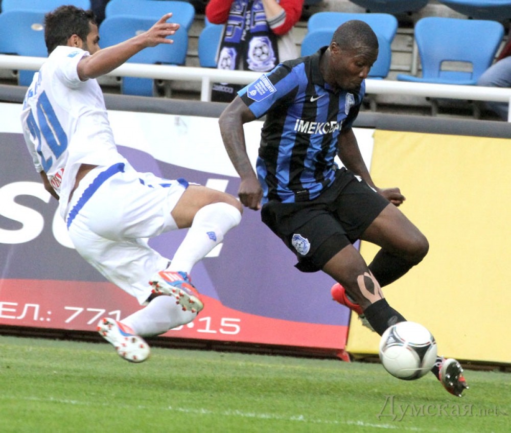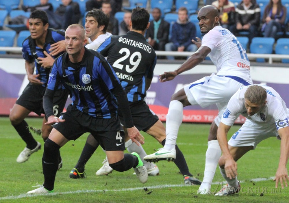В матче 12-го тура Чемпионата Украины среди команд премьер-лиги ФК «Черноморец» выиграл у «Таврии» (Симферополь) со счетом 1:0. Как сообщает пресс-служба одесского клуба, матч состоялся 21 октября на стадионе «Черноморец», где собрались почти 19 тысяч зрителей. На этот раз одесская команда снова не могла выставить оптимальный состав атакующих футболистов. Если поединок в Мариуполе из-за дисквалификации пропускал Леонардо Де Матос, то теперь перебор желтых карточек оставил вне игры Лучиана Бурдужана. На место центрфорварда с первых минут выдвинулся Элис Бакай. Тренер крымчан Олег Лужный после некоторого перерыва вернулся к схеме с одним форвардом, которым стал Антон Шиндер. В среднюю линию вернулись Юрий Путраш и опытный Максим Калиниченко. Первый голевой момент создал Де Матос, который выиграл силовую борьбу у соперника на линии штрафной и мог забивать, но не попал в ворота. Во втором тайме «Таврия» стала больше владеть мячом на нашей половине поля, одесситы старались проводить опасные контратаки. Это не слишком получалось, не хватало последнего паса. Элис Бакай на позиции левого вингера сумел не только обострить игру, но и открыть счет. Его гол стал настоящим шедевром. После заброса Кирилла Ковальчука из глубины Элис одним касанием переиграл соперника, а вторым послал мяч точно в правую «девятку» — 1:0. СМЕРТЬ РОСІЙСЬКИМ ОКУПАНТАМ! Помітили помилку? Виділяйте слова з помилкою та натискайте control-enter |