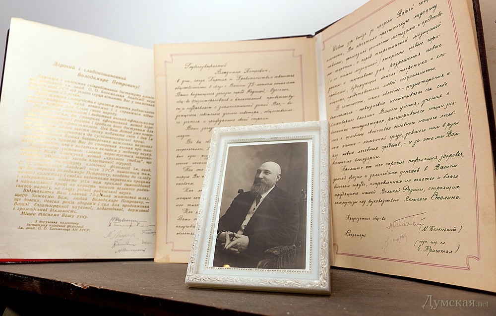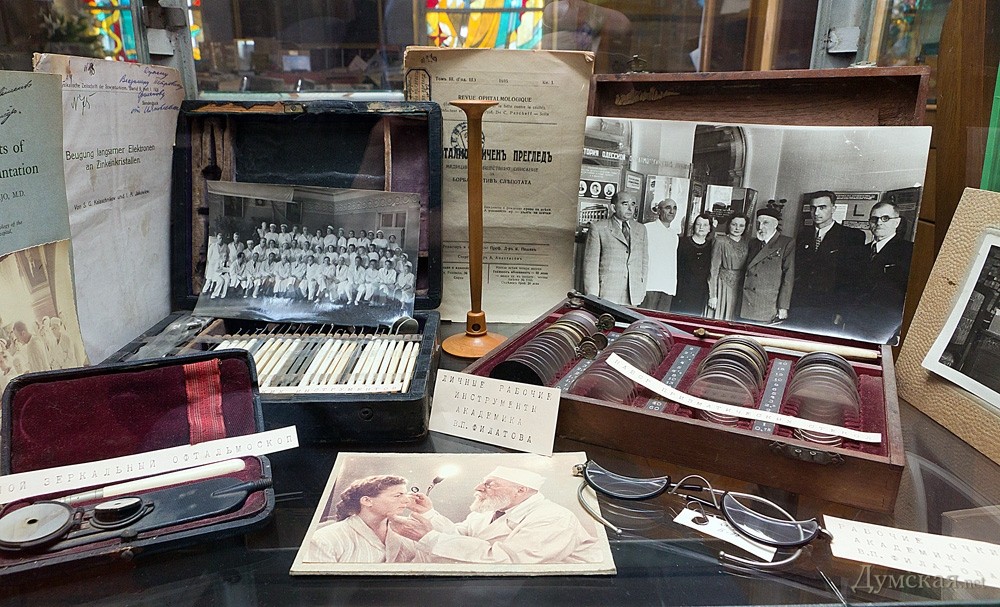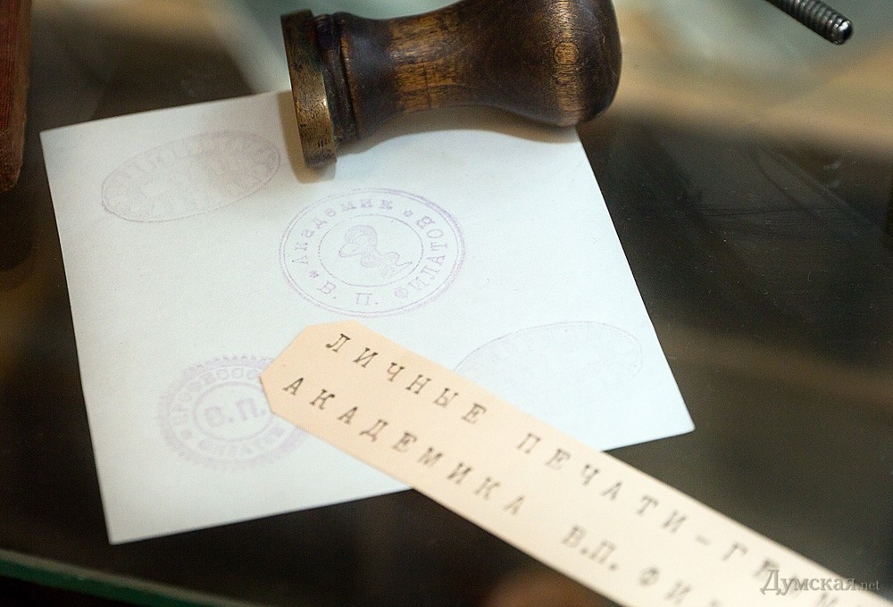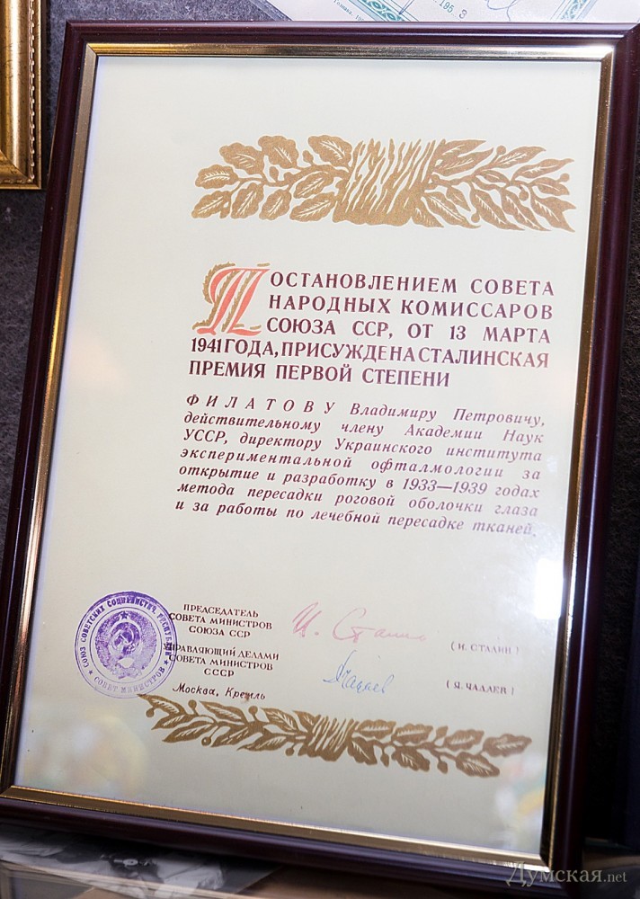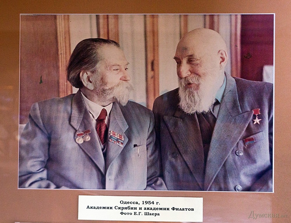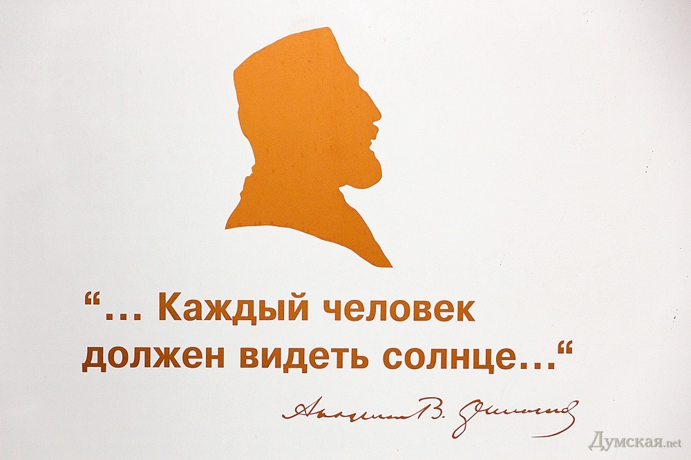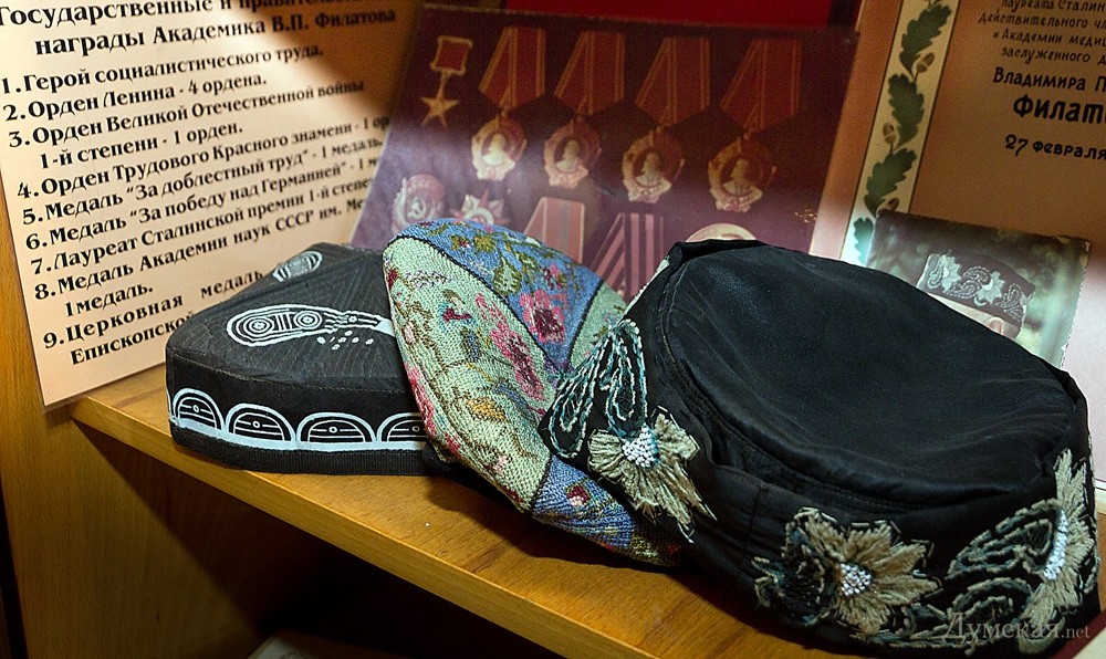 Музей Филатова: после операции академик водил своих пациентов на берег моря«Думская» продолжает рубрику о малоизвестных одесских музеях. На этот раз ваш корреспондент побывал в музейном комплексе академика Филатова, расположенном в научно-исследовательском институте глазных болезней на Французском бульваре. Здесь, на запыленных стенах и стеллажах, хранится память не только о великом офтальмологе, но и о многогранном, талантливом и высокодуховном одессите. В редкие минуты отдыха Владимир Филатов изучал иностранные языки, музицировал, сочинял стихи и писал картины. Все экспонаты и документы не удалось уместить в один зал, поэтому музеев образовалось сразу три – кабинет-музей Филатова в главном корпусе института, мемориальный Дом-музей, в котором жил академик, и собственно музей на втором этаже лабораторного корпуса. Отсюда мы и начнем экскурсию. Первое, на что обращает внимание нечастый посетитель — полотно с крылатой и пробивающей на дрожь фразой ученого: «Каждый человек должен видеть солнце». По словам основателя и директора музея, члена Национального союза театральных деятелей и союза журналистов Украины Натальи Коваленко, эти слова родились у Филатова еще в юности, когда он впервые увидел слепого человека. «Его настолько поразил, до комка в горле, этот слепой, что он сразу же понял свое предназначение. Он пришел к матери и сказал, что цель его жизни – спасать людей от слепоты», — рассказывает Наталья Борисовна. Спустя годы эта фраза стала лейтмотивом всей его деятельности. Своих пациентов после операции он вел на берег моря и лишь там снимал бинты с глаз. Первое, что видел исцеленный человек – море и солнце. Раньше этот участок, выходящий на море, находился на территории института, но потом его выкупили, а на месте, откуда пациенты смотрели на воду и чаек, вырос очередной особняк. Первый зал музея кажется совершенно оторванным от биографии великого офтальмолога – огромный холл увешан пейзажными картинами и стихами. Подойдя поближе, читаем подпись на полотне: «Воталиф». Разгадать эту загадку с первого раза не так-то просто, но после подсказки директора мы читаем буквы задом наперед и получаем «Филатов». Оказывается, все эти картины — с бушующим морем, тихим штилем, поздней осенью и цветущей сиренью — принадлежат его кисти. Еще Филатов писал стихи – здесь представлен сборник его поэзии, который увидел свет уже после смерти автора. В следующем зале расположились экспонаты, имеющие непосредственное отношение к жизни академика — уникальные фотографии, рукописи, письма, раритетные издания, личные вещи. Среди них есть перчатки и знаменитые тюбетейки, под которыми стеснительный доктор прятал лысину. Привязанность Филатова к этому головному убору сделала великого офтальмолога законодателем медицинской моды — именно с его подачи врачи той эпохи стали носить шапочки-таблетки. Среди множества раритетных фотографий, грамот и наград выделяется стенд с медицинскими инструментами. Большинство из них ученый изобретал и делал сам. Есть здесь и очки с половинками стекол, и даже очки с эффектом 3D – они позволяли видеть изображение в объемном виде. Правда, патентовать свои изобретения ученый не спешил, считая это признаком гордыни. «Здесь есть такой экспонат, как палисандровая трубочка. Она безотлучно была с ним в верхнем карм