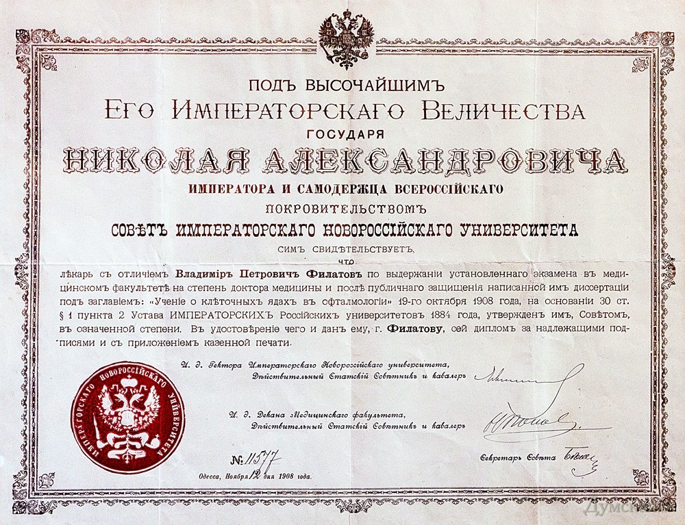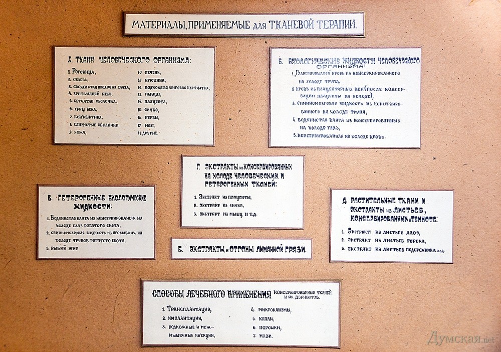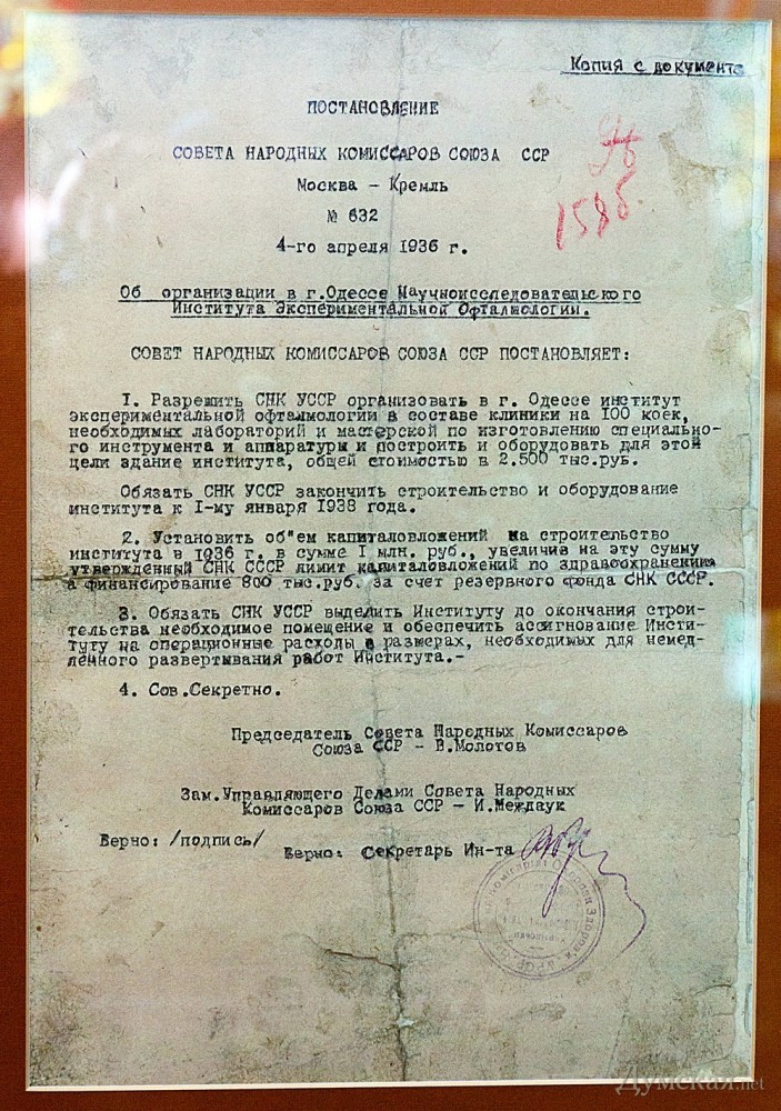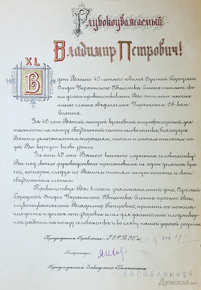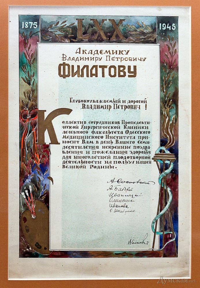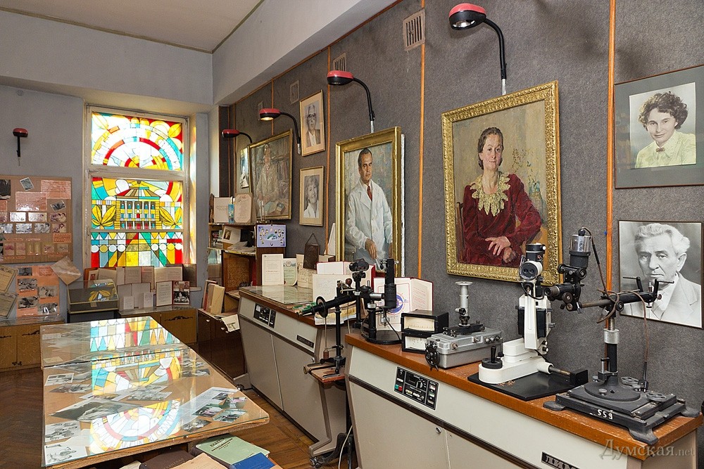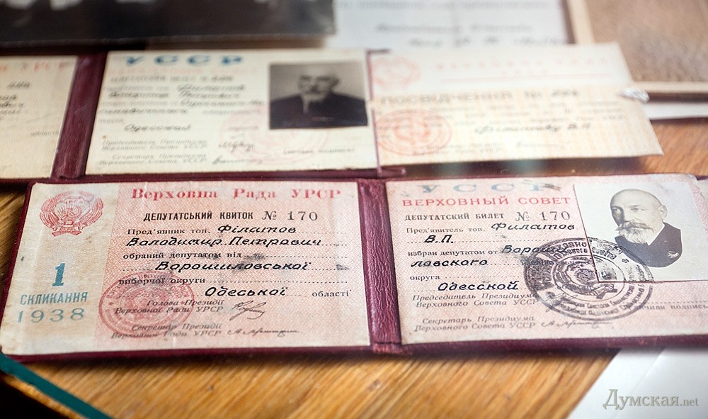 Музей Филатова: после операции академик водил своих пациентов на берег моря«Думская» продолжает рубрику о малоизвестных одесских музеях. На этот раз ваш корреспондент побывал в музейном комплексе академика Филатова, расположенном в научно-исследовательском институте глазных болезней на Французском бульваре. Здесь, на запыленных стенах и стеллажах, хранится память не только о великом офтальмологе, но и о многогранном, талантливом и высокодуховном одессите. В редкие минуты отдыха Владимир Филатов изучал иностранные языки, музицировал, сочинял стихи и писал картины. Все экспонаты и документы не удалось уместить в один зал, поэтому музеев образовалось сразу три – кабинет-музей Филатова в главном корпусе института, мемориальный Дом-музей, в котором жил академик, и собственно музей на втором этаже лабораторного корпуса. Отсюда мы и начнем экскурсию. Первое, на что обращает внимание нечастый посетитель — полотно с крылатой и пробивающей на дрожь фразой ученого: «Каждый человек должен видеть солнце». По словам основателя и директора музея, члена Национального союза театральных деятелей и союза журналистов Украины Натальи Коваленко, эти слова родились у Филатова еще в юности, когда он впервые увидел слепого человека. «Его настолько поразил, до комка в горле, этот слепой, что он сразу же понял свое предназначение. Он пришел к матери и сказал, что цель его жизни – спасать людей от слепоты», — рассказывает Наталья Борисовна. Спустя годы эта фраза стала лейтмотивом всей его деятельности. Своих пациентов после операции он вел на берег моря и лишь там снимал бинты с глаз. Первое, что видел исцеленный человек – море и солнце. Раньше этот участок, выходящий на море, находился на территории института, но потом его выкупили, а на месте, откуда пациенты смотрели на воду и чаек, вырос очередной особняк. Первый зал музея кажется совершенно оторванным от биографии великого офтальмолога – огромный холл увешан пейзажными картинами и стихами. Подойдя поближе, читаем подпись на полотне: «Воталиф». Разгадать эту загадку с первого раза не так-то просто, но после подсказки директора мы читаем буквы задом наперед и получаем «Филатов». Оказывается, все эти картины — с бушующим морем, тихим штилем, поздней осенью и цветущей сиренью — принадлежат его кисти. Еще Филатов писал стихи – здесь представлен сборник его поэзии, который увидел свет уже после смерти автора. В следующем зале расположились экспонаты, имеющие непосредственное отношение к жизни академика — уникальные фотографии, рукописи, письма, раритетные издания, личные вещи. Среди них есть перчатки и знаменитые тюбетейки, под которыми стеснительный доктор прятал лысину. Привязанность Филатова к этому головному убору сделала великого офтальмолога законодателем медицинской моды — именно с его подачи врачи той эпохи стали носить шапочки-таблетки. Среди множества раритетных фотографий, грамот и наград выделяется стенд с медицинскими инструментами. Большинство из них ученый изобретал и делал сам. Есть здесь и очки с половинками стекол, и даже очки с эффектом 3D – они позволяли видеть изображение в объемном виде. Правда, патентовать свои изобретения ученый не спешил, считая это признаком гордыни. «Здесь есть такой экспонат, как палисандровая трубочка. Она безотлучно была с ним в верхнем карм