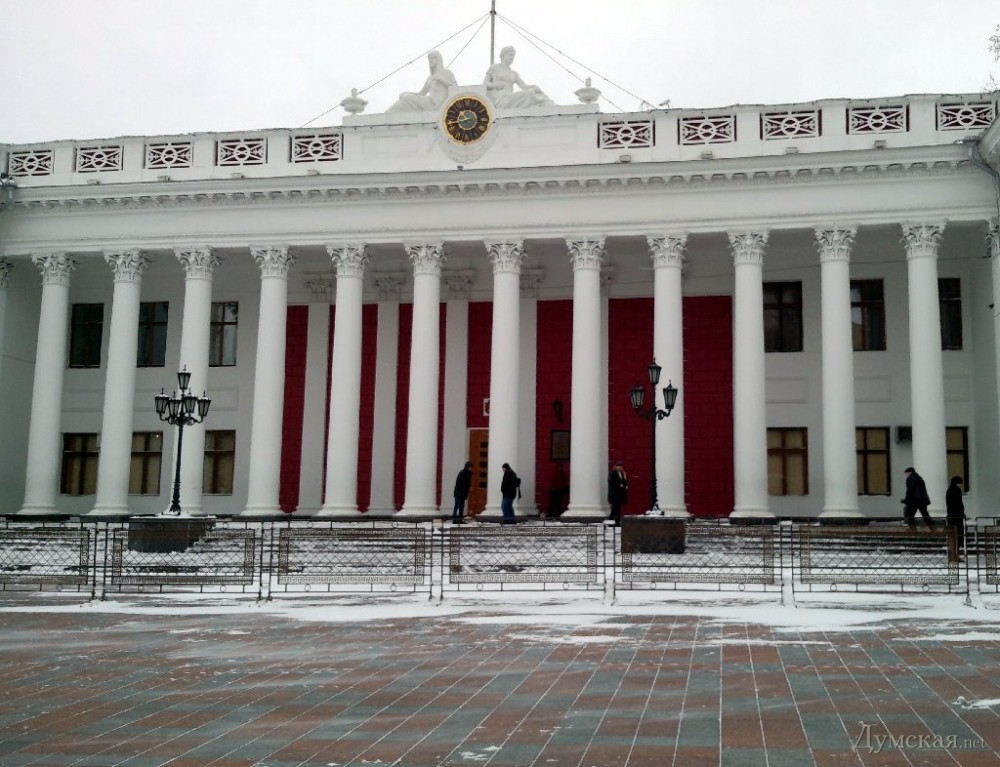 Здание муниципалитета по-прежнему выглядит осажденной крепостью («бандеровский штурм» никто не отменял), но меры предосторожности явно ослаблены. На Думской площади установлен легкий турникет и дежурят несколько милиционеров. В окрестностях интенсивно убирают снег — и вручную, и с помощью техники. В вестибюле горсовета нет размотанных пожарных шлангов, отсутствуют озабоченные люди в масках и революционно настроенные матросы с чайниками. Документы у входящих почти не проверяют.