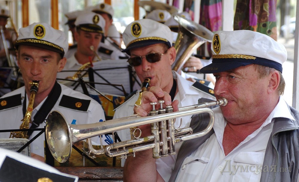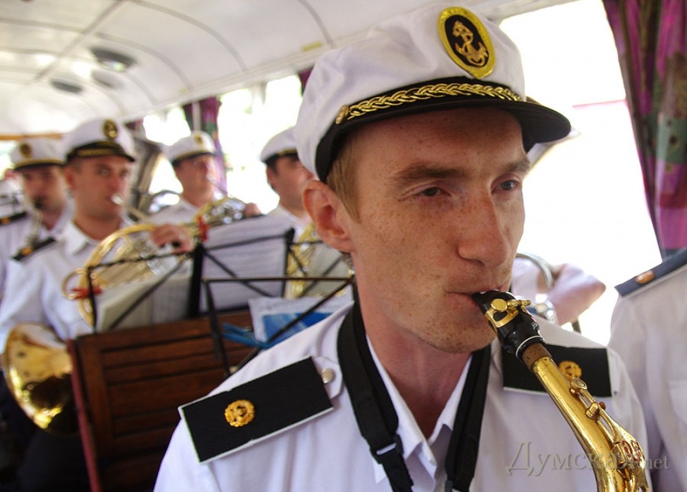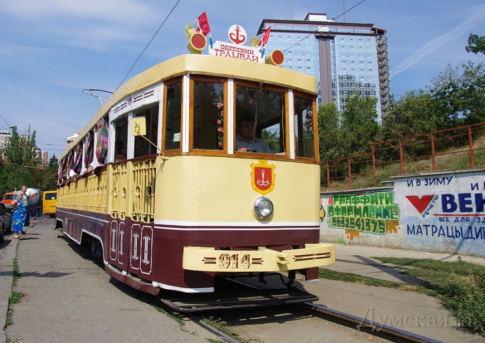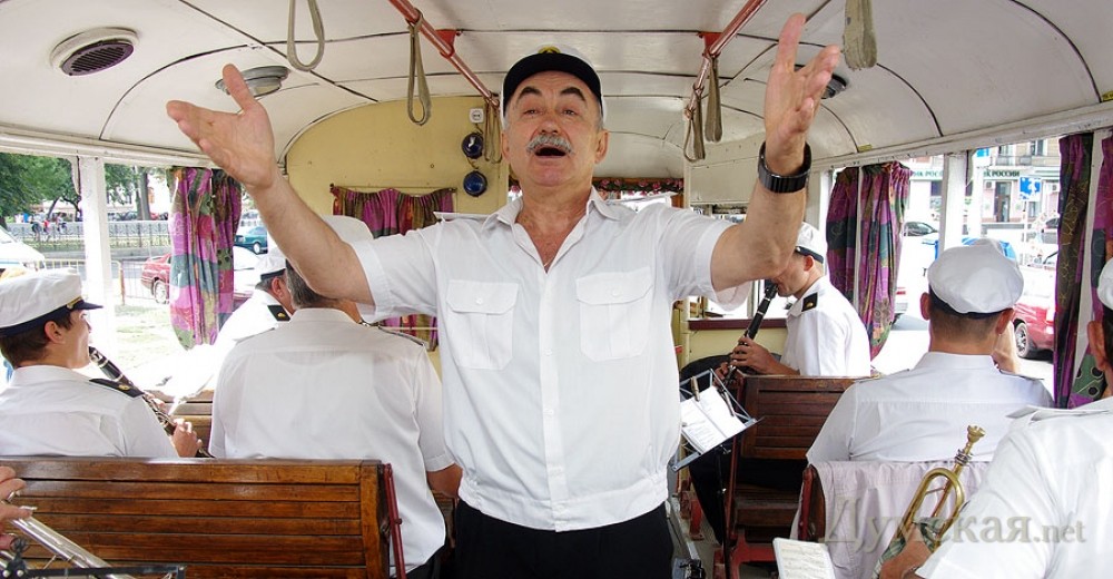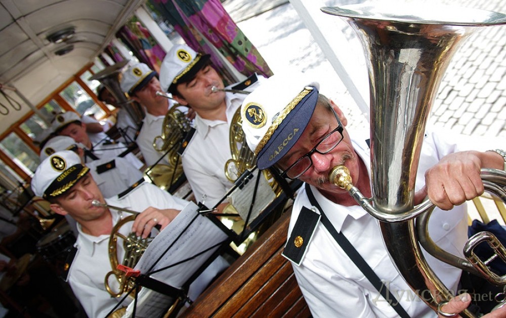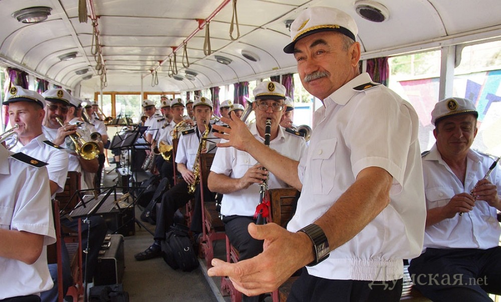 Несколько раз в году знаменитый прогулочный «ретро-трамвай», который в теплое время года курсирует по пятому маршруту от Аркадии до Староконки, становится музыкальным и радует ухо горожан и гостей города то джазом, то классикой, то одесским шансоном. Как правило, это происходит на День города. Сегодня старенький трамвай в очередной раз превратился в мобильную концертную площадку. «Думская» решила прокатиться на колбасе ретро-«пятерочки» и выяснить, почем билет и сильно ли трясет на главном музыкальном маршруте Одессы. Сам агрегат – на удивление живучий МТВ-82, обычная советская модель 1950-х годов. Конкретно этот вагон построили в 1954 году на Рижском вагоностроительном заводе и передали в одесское трамвайное депо им. Ленина, где он прослужил без малого десять лет. Пожар, случившийся в депо в феврале 64-го, испепелил и наш трамвайчик, после чего его восстановили на ремзаводе и снова выпустили перевозить пассажиров. В 1978-м году вагон переквалифицировался в учебный, а в 1980-м его полностью переделали, стилизовав под «пульман» начала века, и начали использовать в качестве открытого экскурсионно-прогулочного трамвая. Сегодня, спустя почти четверть века, вагон №914 по-прежнему катает в сезон туристов, обслуживает спецзаказы (вроде свадеб и киносъемок), а по праздникам участвует в культурной программе на правах одного из «гвоздей». По словам водителя железного старичка Виталия, трамвай очень неприхотлив и надежен, к тому же легко ремонтируется. Примитивная, по нынешним меркам, система управления позволяет вагоновожатому получать от работы больше удовольствия, чем проблем. «Я люблю этот трамвай, — говорит водитель с 25-летним стажем. — И пассажиры любят.Движение очень плавное, это не поездка, а прогулка. Абсолютно никакого негатива: едешь себе спокойно, солнце греет, ветерок обдувает. Жаль только, что вагон летний, и использовать его можно максимум пять месяцев в году». Но сегодня главная изюминка старинного трамвая — не в его технических характеристиках и внешних данных, а в музыке. В День города за звуковую часть отвечает муниципальный театр духовой музыки имени А. Салика под управлением Михаила Дзевика. Каждую пятницу оркестр выступает в городском саду (куда, пользуясь случаем, дирижер и приглашает читателей «Думской»), а 2 сентября грузится на ретро-трамвай и колесит по улицам, развлекая народ тематическими мелодиями. Сегодня День города, а не День победы, посему и музыка должна быть соответствующей: «Хава нагила», «Живи, моя Одесса», «У Черного моря», «Тумбалалайка», «Ты одессит, Мишка» и другие, знакомые каждому горожанину вещи. Сами музыканты выступление в трамвае воспринимают больше как почетную обязанность, чем как возможность показать класс. Причина тому совершенно тривиальна: для шоу ретро-транспорт совершенно не приспособлен. «На этом трамвае мы катаемся раз в год, на День города, — рассказывает Сергей Дзевик. — На джазовых фестивалях, например, тут дирижирует Юра Кузнецов. На День победы может гарнизонный оркестр поездить. Играть в трамвае неудобно: мундштуки бьют по лицу, очень тесно, партитуры постоянно норовят упасть. В общем, на ходу качественно исполнять музыку попросту невозможно. Поэтому мы играем на остановках, а в движении у нас получается передышка». Есть у оркестрантов и другие печали. Старики сетуют на погоду, на