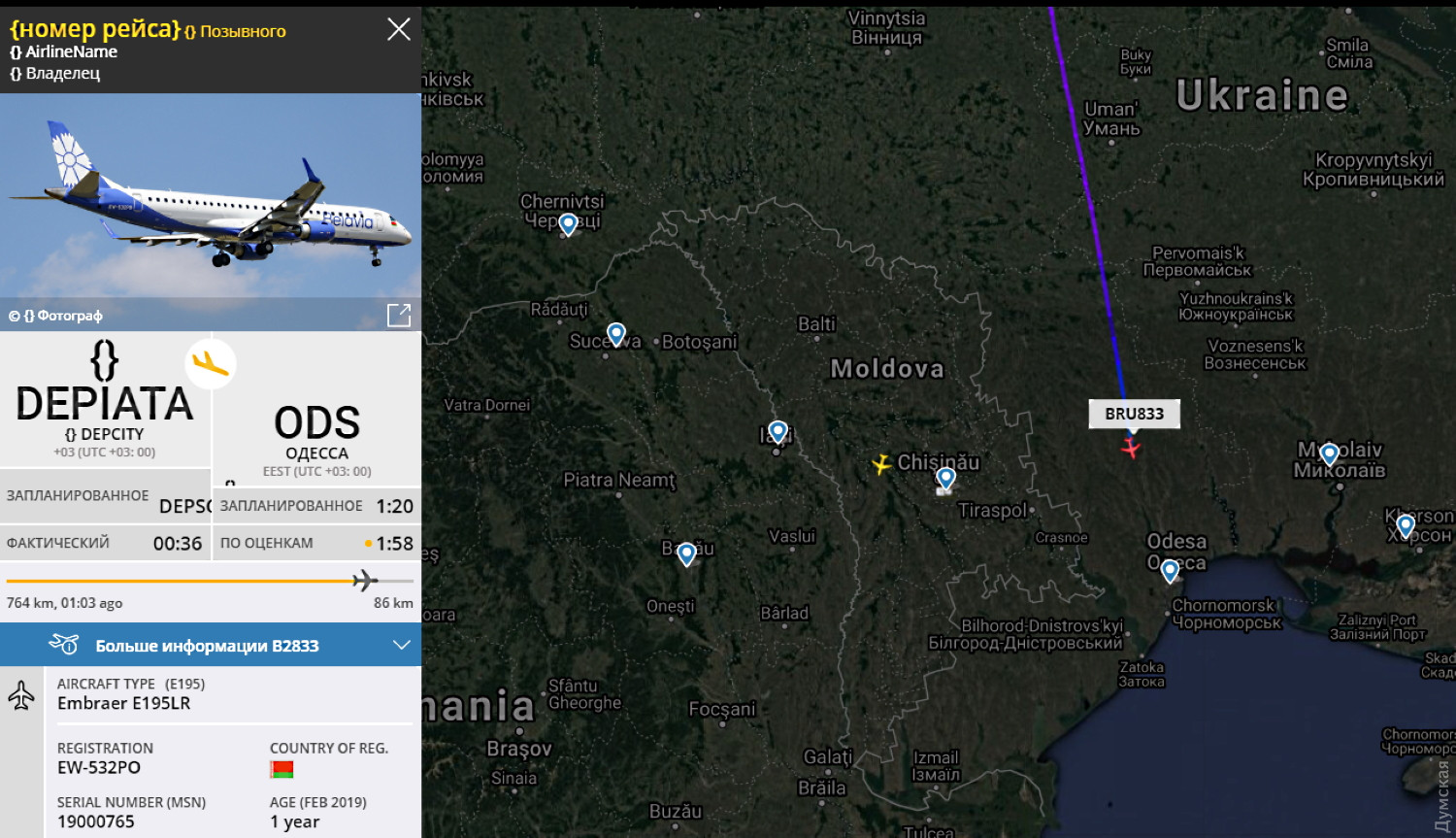 В 1:58 самолет Embraer-195 авиакомпании «Белавиа» прибыл в Одессу из Минска, а в 3:20 борт отправился в обратный путь.