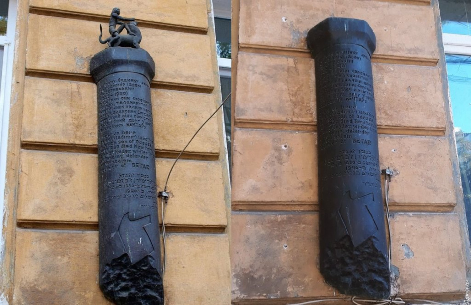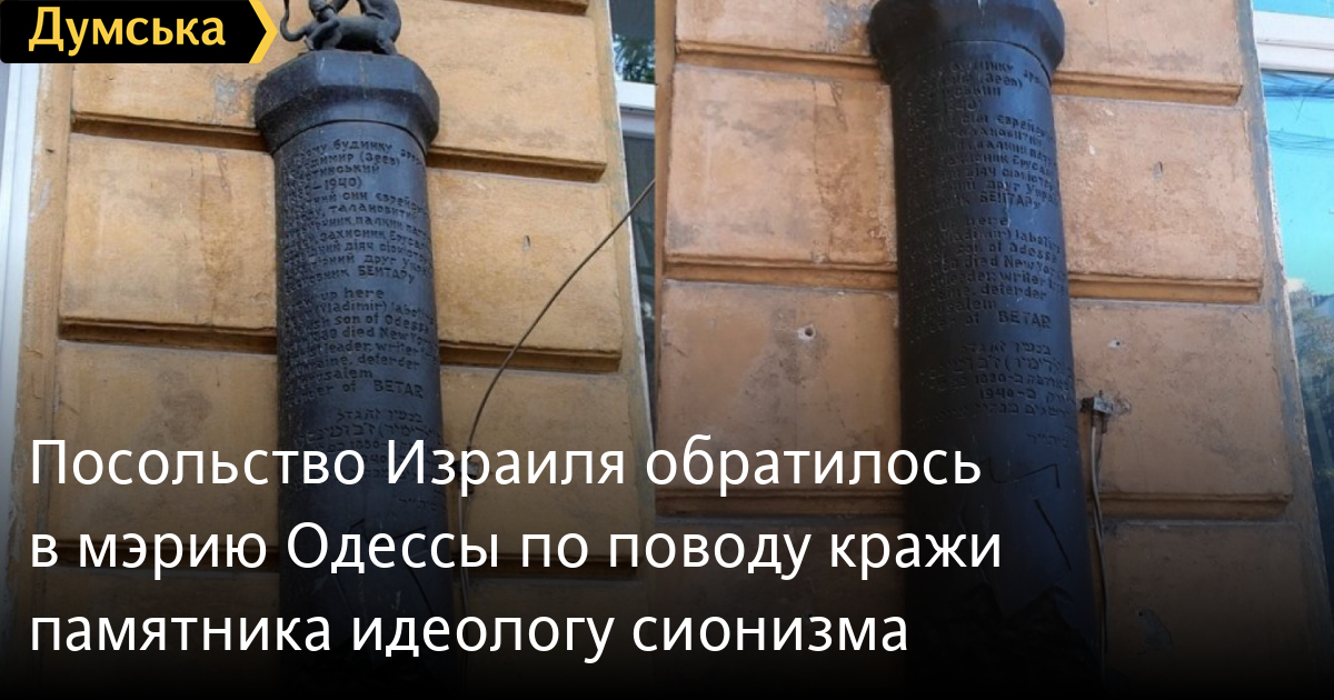 Посольство Израиля обратилось в мэрию Одессы по поводу кражи памятника идеологу сионизмаЧрезвычайный и полномочный посол Государства Израиль в Украине Йоэль Лион обратился в Одесский горсовет в связи с недавней пропажей памятного знака идеологу сионизма-ревизионизма, создателю Еврейского легиона, писателю и журналисту Владимиру (Зееву) Жаботинскому. В мэрии пообещали рассмотреть вопрос о восстановлении мемориальной доски, сообщает пресс-служба диппредставительства. «Департамент международного сотрудничества и маркетинга Одесского городского совета сообщил, что Приморская районная администрация города Одессы совместно с департаментом городского хозяйства Одесского городского совета должна рассмотреть вопрос восстановления барельефа Зеева Жаботинского на доме №1 по улице Еврейской в Одессе», — говорится в сообщении посольства. Также горсовет направил в полицию заявление о прошлогодней краже скульптуры Самсона, установленной на доске Жаботинскому. В пресс-службе Главного управления Нацполиции в Одесской области пока затрудняются ответить, по какой статье расследуют данное преступление.