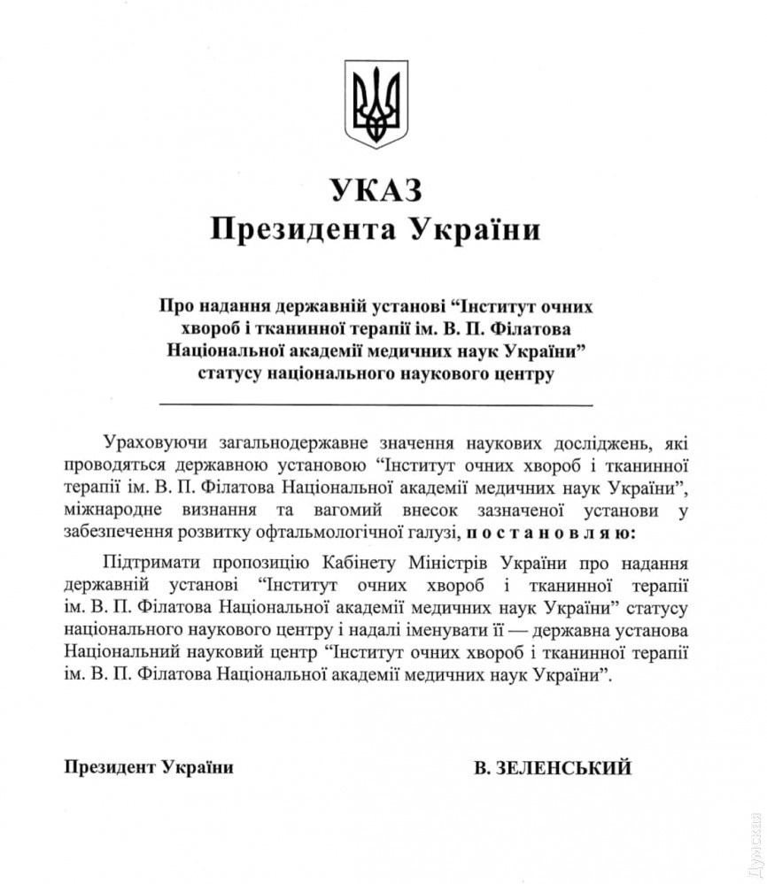 Государственное учреждение «Институт глазных болезней и тканевой терапии имени В.П. Филатова» Национальной академии наук Украины станет национальным научным центром.