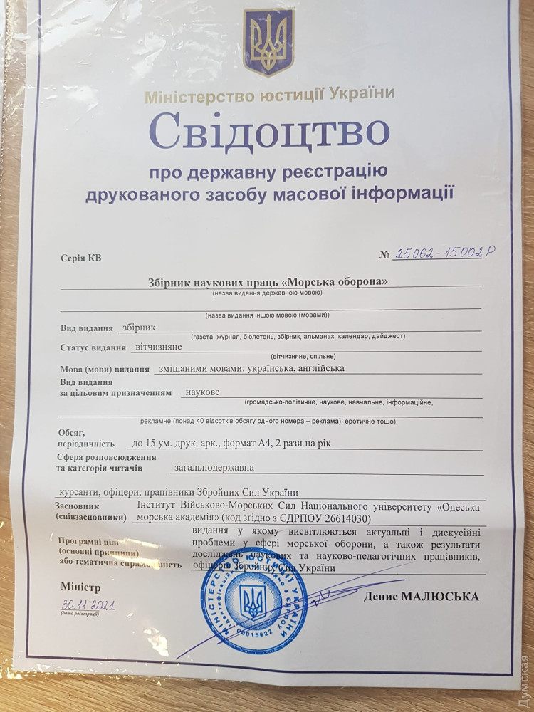 Одесский институт ВМС основал первое в Украине научное издание, посвященное военно-морской проблематикеИнститут военно-морских сил национального университета «Одесская морская академия» зарегистрировал собственное научное периодическое издание. Об этом сообщил руководитель вуза капитан первого ранга Максим Кириакиди. По его словам, журнал получил название «Морская оборона» и стал первым специализированным научным военно-морским изданием в Украине. Сейчас формируется редакционная коллегия журнала. В институте надеются, что она будет международной. СМЕРТЬ РОСІЙСЬКИМ ОКУПАНТАМ! Помітили помилку? Виділяйте слова з помилкою та натискайте control-enter Новини по цій темі: 13 лютого 2025: Одеські виші скорочують і об`єднують: Юракадемію повернули до складу університету Мечникова - хто наступний? 13 січня 2025: Реформа: в Одесі об`єднують два морські університети, а інститут ВМС стане самостійною академією 10 січня 2025: В Одеську область прилетіли птахи в мазуті: чи дійдуть нафтопродукти від затонулих російських танкерів до нашого узбережжя? 27 листопада 2024: Одеські вчені перевірили на побочку відомі ліки від ковіду, Еболи та гепатиту С: спойлер - є проблеми |