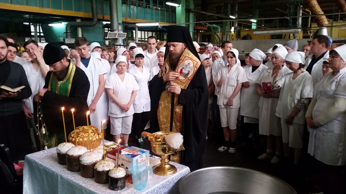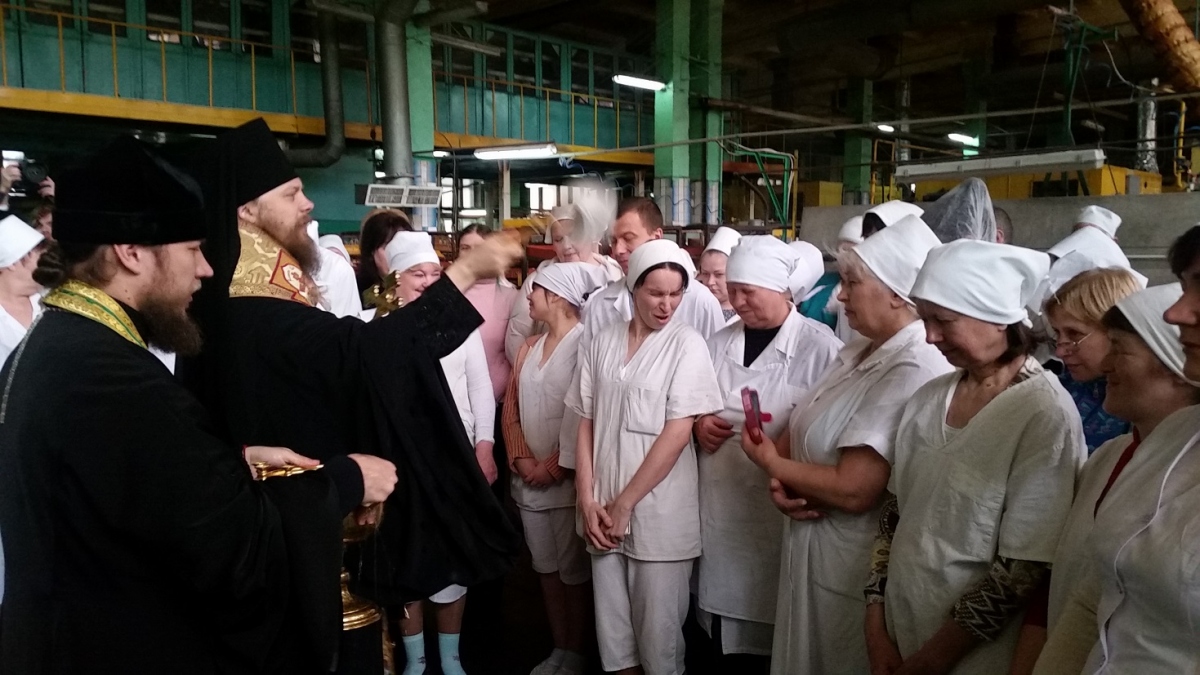 Традиционно перед началом выпечки православный священник отслужил на заводе молебен и освятил производственную линию.