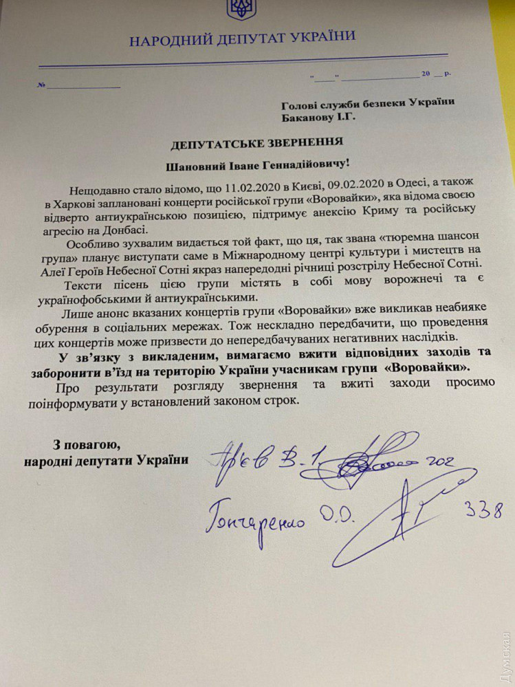 Народные депутаты Алексей Гончаренко и Владимир Арьев написали обращение на имя главы СБУ Ивана Баканова с требованием запрета въезда в Украину российской группы «Воровайки».