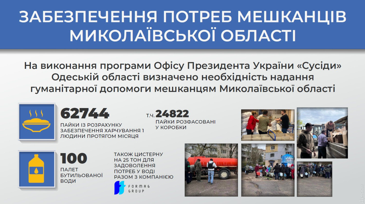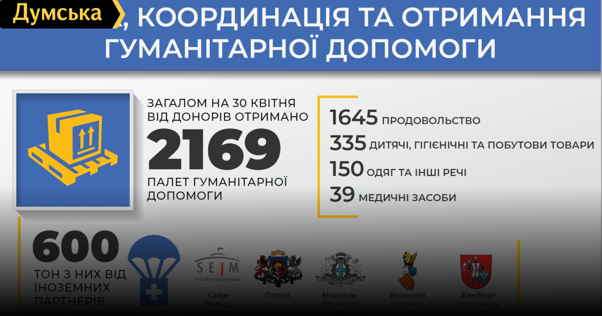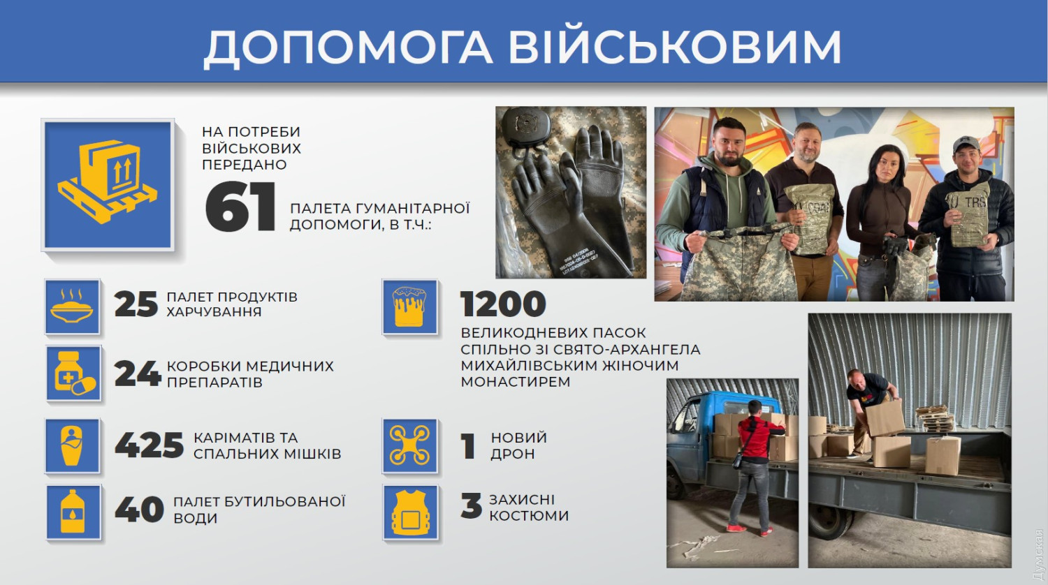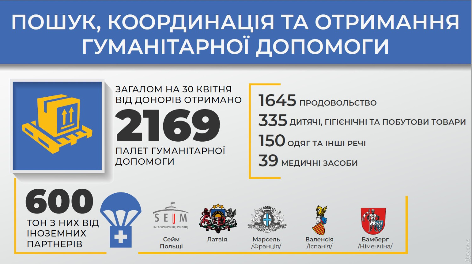 Одесский областной Гуманитарный штаб за апрель оказал помощь более 52 тысячам человекБолее 52 тысяч человек, в том числе 17 тысяч одесситов, в апреле получили помощь от Гуманитарного штаба при Одесской областной военной администрации. Об этом сообщил глава штаба Алексей Черный. По его словам, за апрель штаб получил 2169 паллет гуманитарной помощи (вес каждого от 500 до 850 кг). Больше всего поступило продовольствия (1645 паллет), детских и гигиенических товаров (335), одежды (150) и медикаментов (39). От заграничных доноров – Польши, Латвии, а также из городов Марсель, Валенсия и Бамберг. Паллеты перевозили на 117 грузовиках и 50 ж/д вагонах. Грузы хранят на 107 складах, из которых пять в Одессе, семь в райцентрах области, 94 – в громадах, еще один склад расположен в Румынии. По словам Алексея Черного, все грузы проходят учет – идет подсчет в паллетах, в килограммах и тоннах, а также через систему «Допомога», в которой отображается наличие грузов и перечень людей, получивших помощь. Кроме помощи жителям Одесской области и переселенцам, областной штаб отправил 70 грузовиков (около 900 паллет) в Николаев, в том числе 100 паллет бутилированной воды и цистерну с 25 тоннами воды. Также штаб помогает армии. За месяц нашим воинам в том числе передали 25 паллет с продовольствием, 24 коробки с медикаментами, 425 карематов, 40 паллетов с водой, 61 паллет с гуманитарной помощью и один дрон. СМЕРТЬ РОСІЙСЬКИМ ОКУПАНТАМ! Помітили помилку? Виділяйте слова з помилкою та натискайте control-enter |