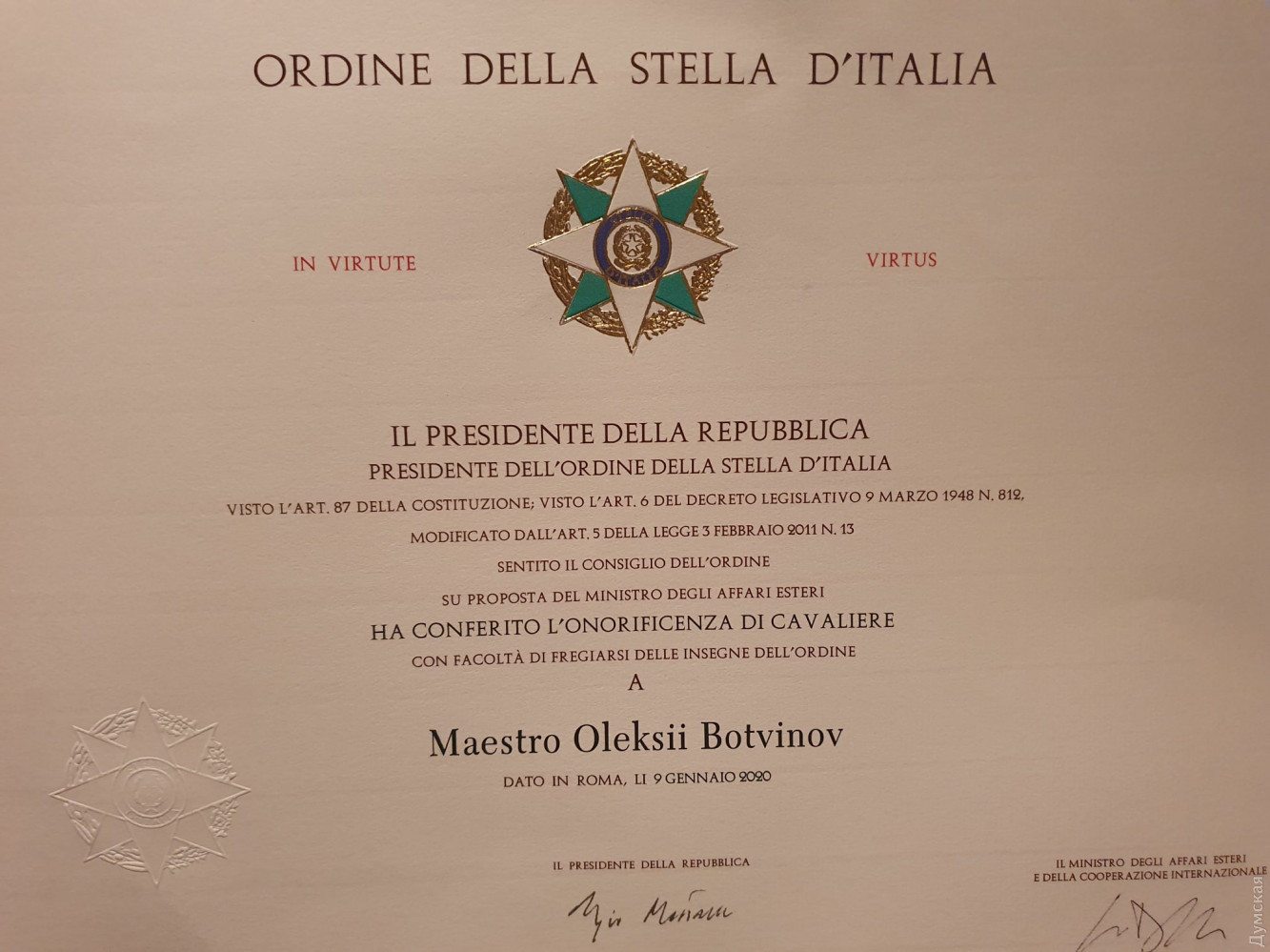 Известный одесский пианист, организатор фестиваля Оdessa Сlassics Алексей Ботвинов стал кавалером ордена Звезды Италии. Соответствующий указ подписал президент Итальянской Республики Серджо Маттарелла. Награду музыканту вручил посол Италии в Украине Давиде ла Чечилиа. При награждении дипломат отметил, что Ботвинов награжден за поддержку культурного сотрудничества Италии и Украины, фестиваль Odessa Classics и серию концертов в миланском Ла Скала. Орден Звезды Италии (итал. Ordine della Stella d’Italia) — государственная награда Итальянской Республики. Вручается итальянцам, проживающим за рубежом, и иностранцам за особые заслуги в развитии дружественных отношений и сотрудничества между Италией и другими странами. У ордена пять степеней: Кавалер Большого креста (итал. Cavaliere di Gran Croce), Великий офицер (итал. Grand’Ufficiale), Командор (итал. Commendatore), Офицер (итал. Ufficiale), Кавалер (итал. Cavaliere). СМЕРТЬ РОСІЙСЬКИМ ОКУПАНТАМ! Помітили помилку? Виділяйте слова з помилкою та натискайте control-enter