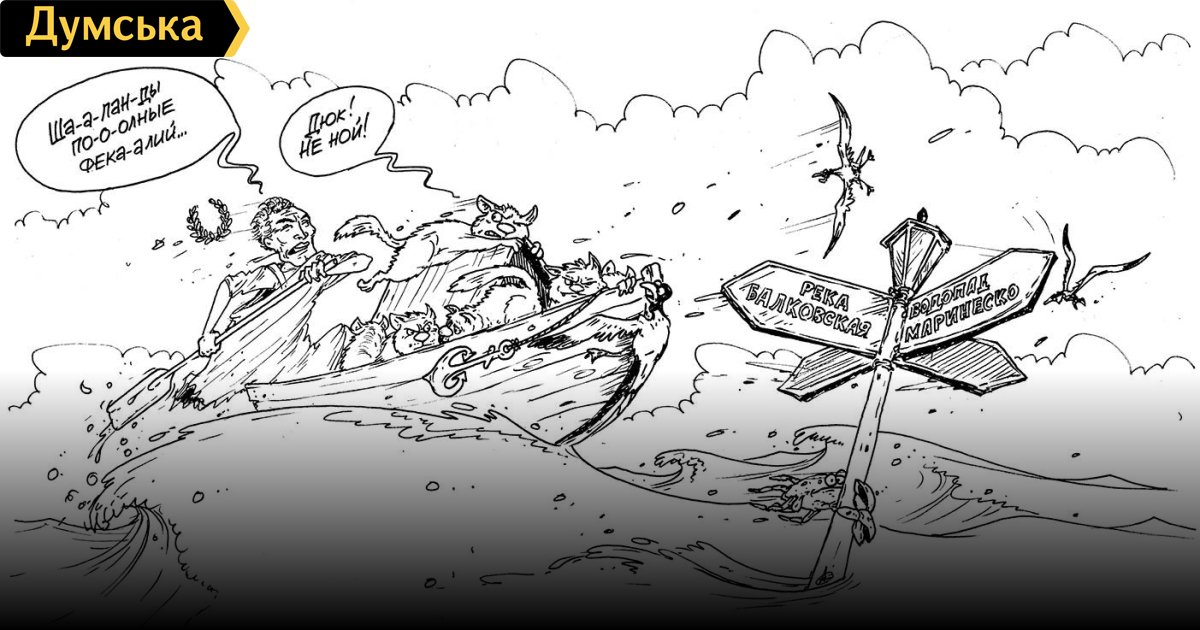 Карикатурист «Думской» Александр Бронзов предлагает свою версию случившегося в Одессе штормового ЧП. Дюк в роли деда Мазая (или Ноя?), коты вместо зайцев, река Балковская и прочий треш от нашего художника. На сей раз черно-белый.