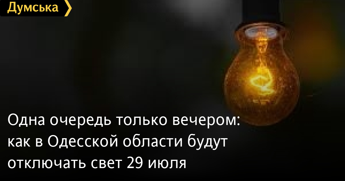 Одна черга відключень лише увечері: як на Одещині вимикатимуть світло 29 липняПогодинні графіки вимкнення електроенергії діятимуть 29 липня в Одеській області, як і в усій країні, з 16:00 до 23:00. У цей період відключатимуть одну чергу споживачів, повідомили в НЕК «Укренерго». В інший час доби обмеження застосовувати не будуть. Подивитися графіки можна в чат-ботах «ДТЕК Одеські електромережі» Viber і Telegram, а також на сайті. СМЕРТЬ РОСІЙСЬКИМ ОКУПАНТАМ! Помітили помилку? Виділяйте слова з помилкою та натискайте control-enter |
