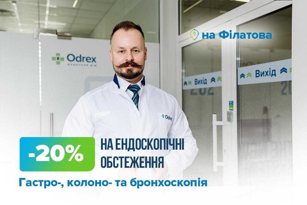 Odrex на Філатова дарує -20% на ендоскопічну діагностику (новини компаній)Січень – це той час, коли варто потурбуватися про здоров’я шлунково-кишкового тракту, оскільки важка їжа та переїдання на свята не найкращим чином позначаються на його стані. Саме тому Багатопрофільна лікарня Odrex на Філатова дарує 20% знижку* на ендоскопічну діагностику – акція триватиме протягом усього січня. Дослідження проводить хірург та ендоскопіст вищої категорії Дмитро Корчовий. Які процедури можна зробити зі знижкою? • Гастроскопія – діагностика верхнього відділу шлунково-кишкового тракту (стравоходу, шлунка та кишківника). • Колоноскопія – дослідження товстої та прямої кишки. В якості скринінгу процедура показана всім після досягнення 40 років. • Бронхоскопія – дослідження слизової оболонки гортані, трахеї та бронхів. Для зручності пацієнтів в Odrex є можливість провести гастроскопію та колоноскопію комплексно. Також усі три дослідження можна проводити під медикаментозним сном – це набагато комфортніше і для пацієнта, і для лікаря. Багатопрофільна лікарня Odrex на Філатова – новий медичний центр в Одесі, який надає первинну, вторинну та третинну допомогу.