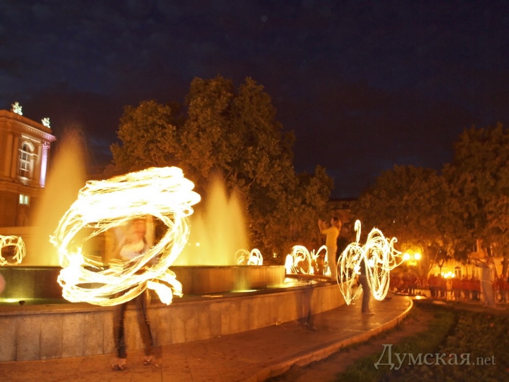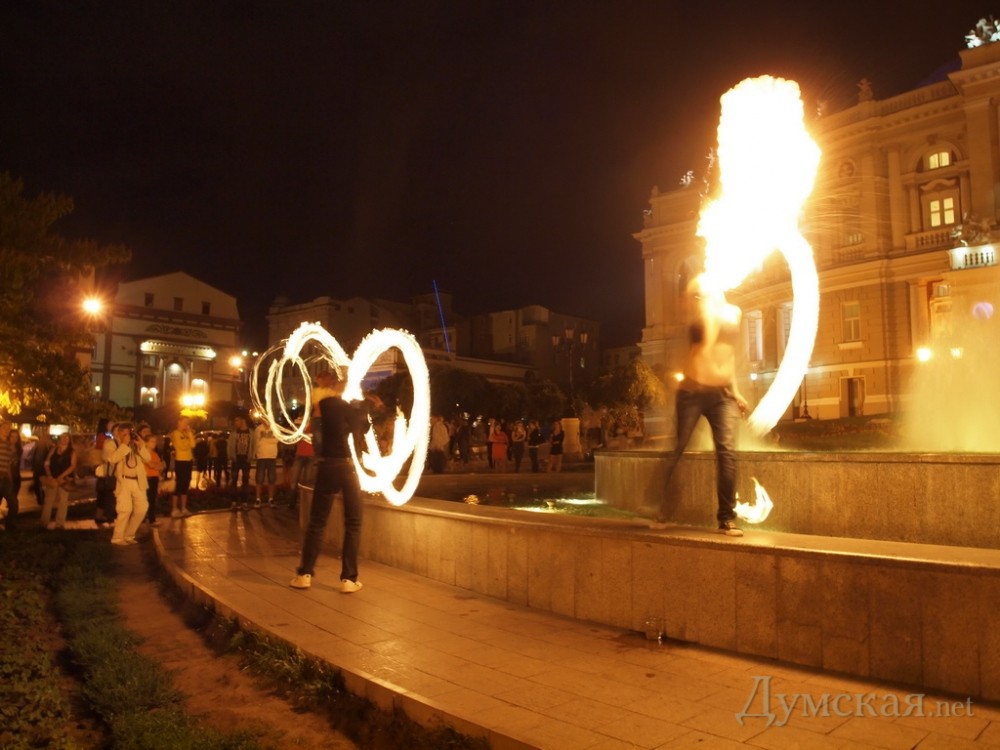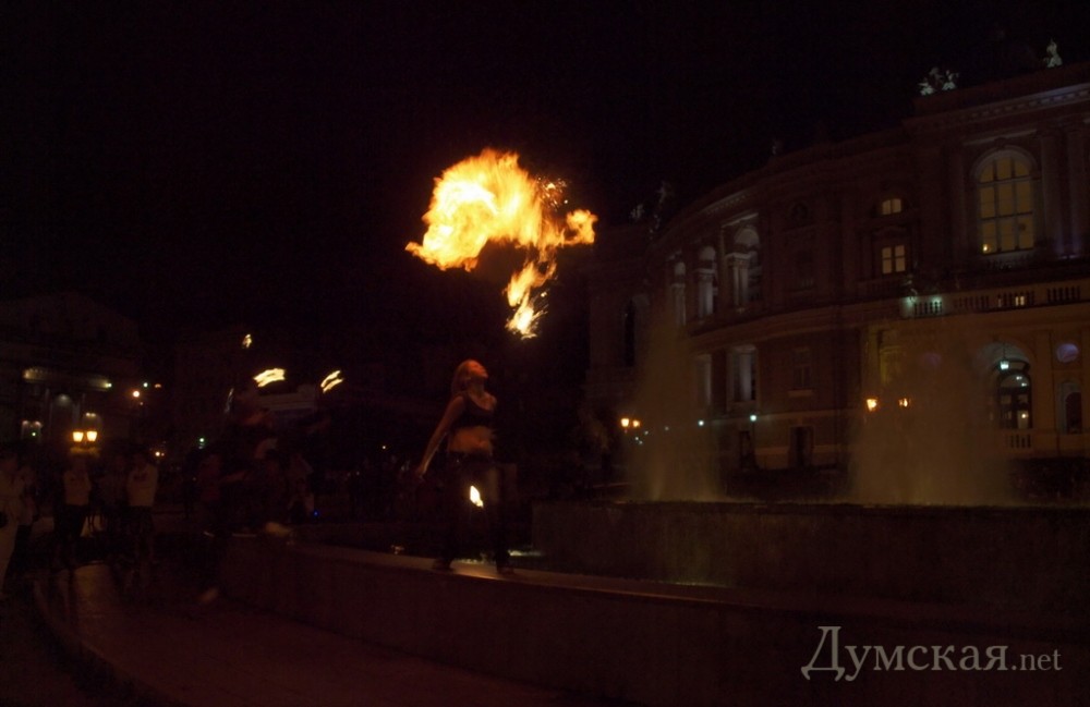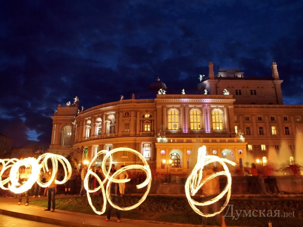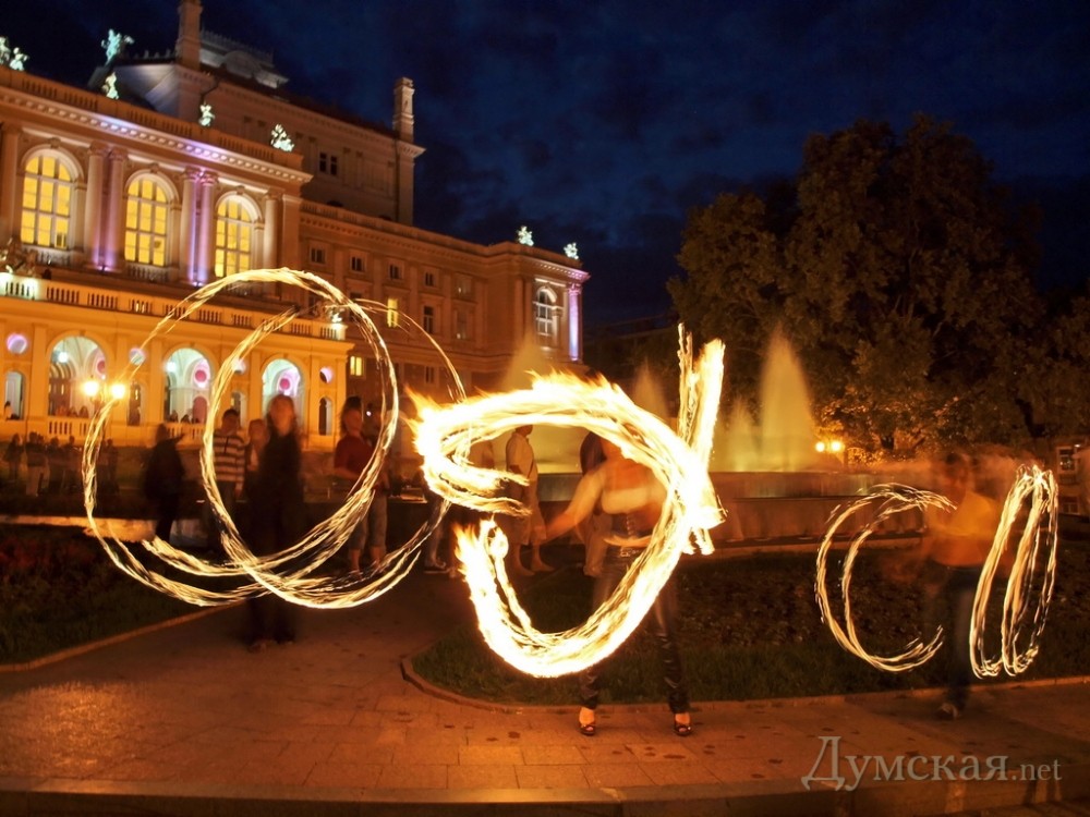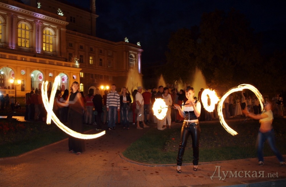 Необычное мероприятие, гвоздем которого было фаер-шоу, состоялось вечером 9 сентября возле Одесского оперного театра. Организаторы действа (творческий коллектив Одесской киностудии «Арт-Среда») предлагают новый формат подобных акций — арт-моб.
