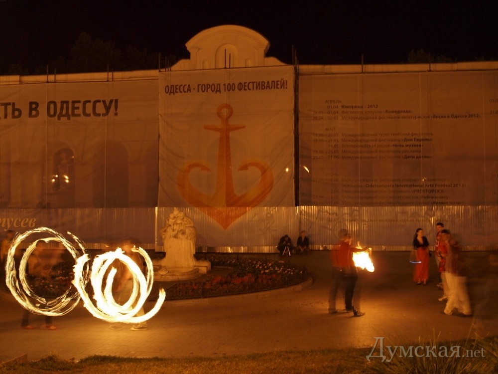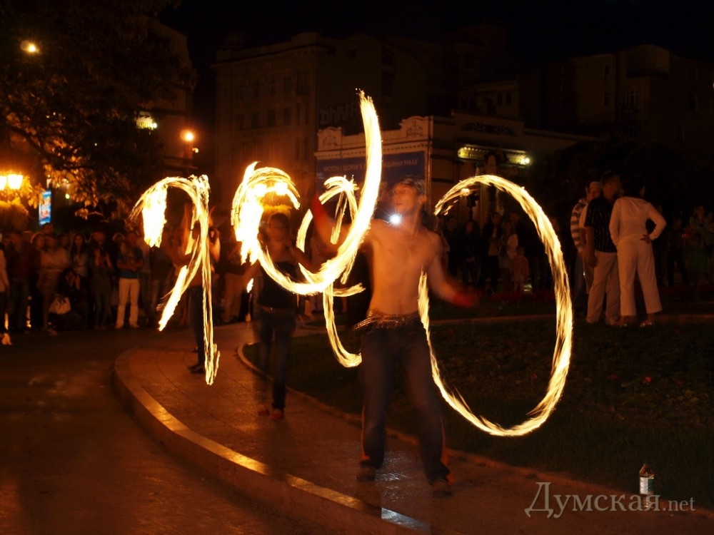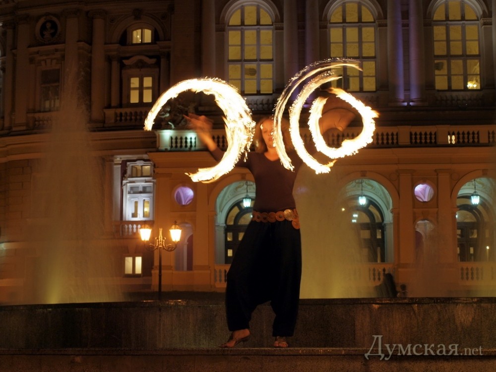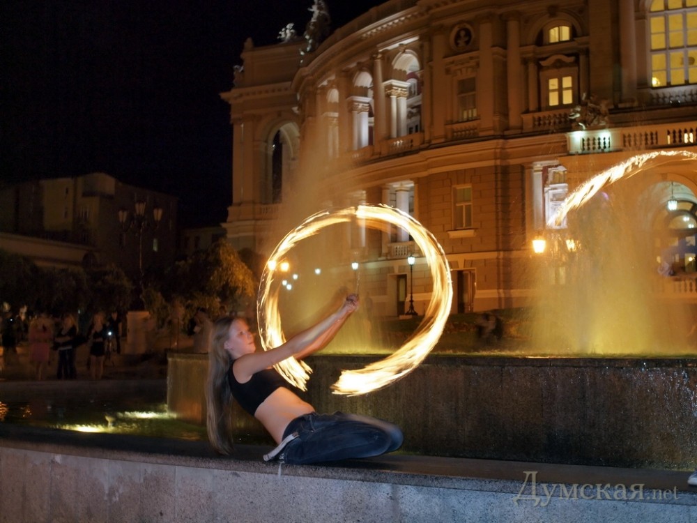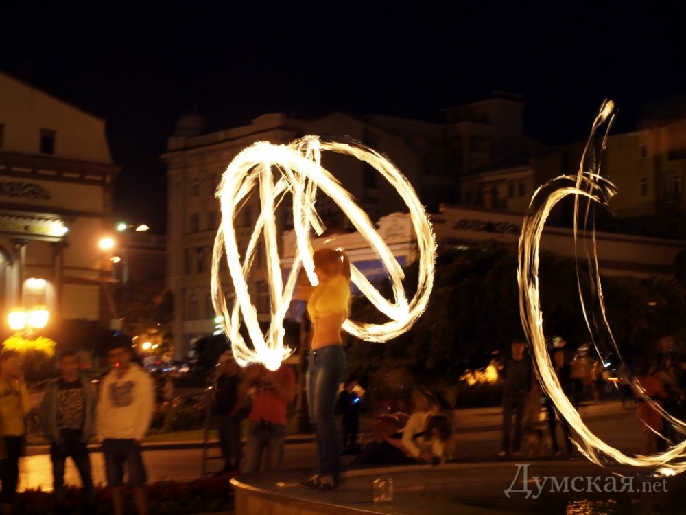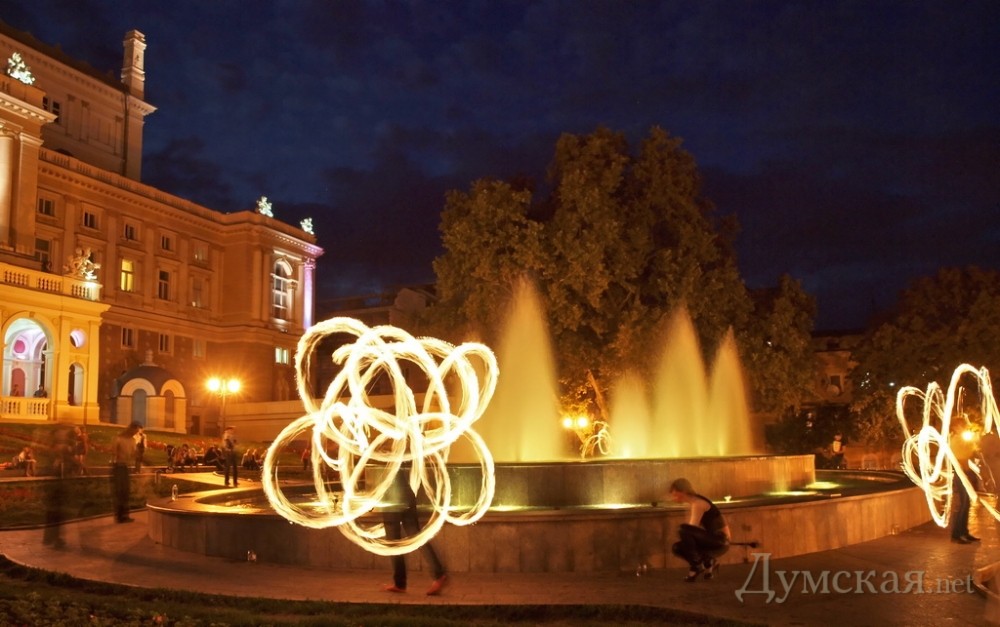 Необычное мероприятие, гвоздем которого было фаер-шоу, состоялось вечером 9 сентября возле Одесского оперного театра. Организаторы действа (творческий коллектив Одесской киностудии «Арт-Среда») предлагают новый формат подобных акций — арт-моб.
