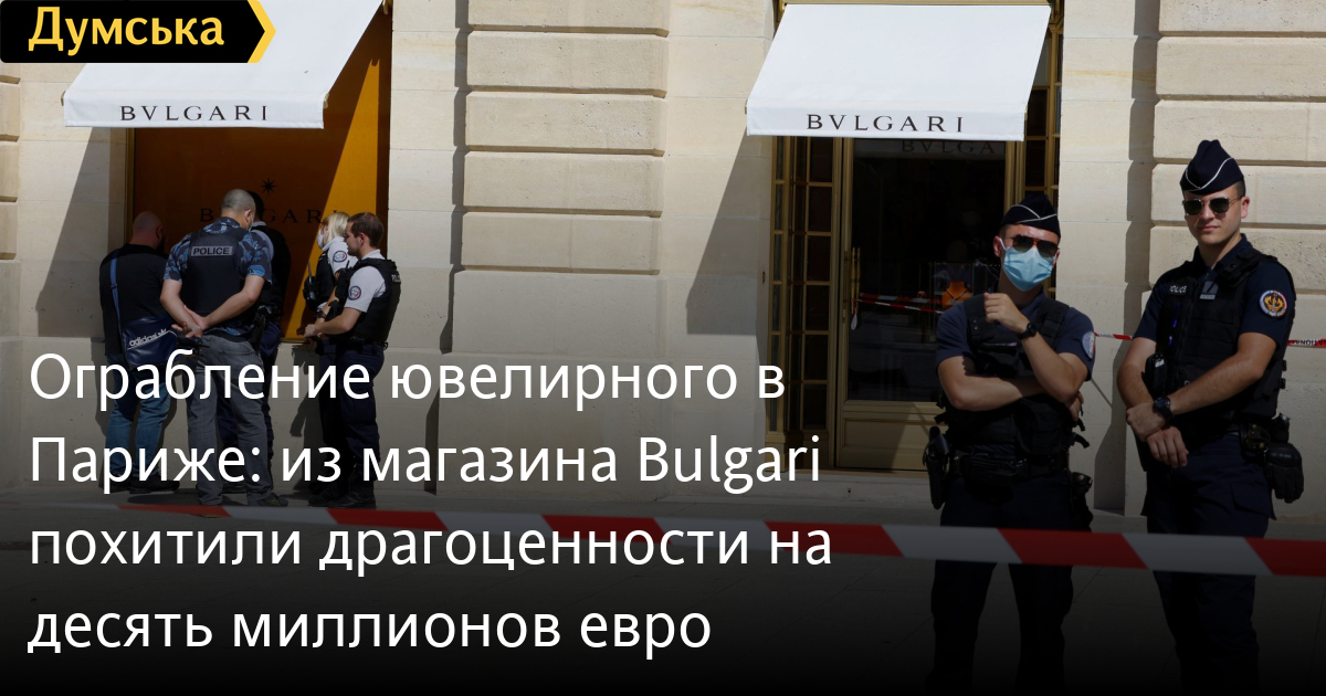 Ограбление ювелирного в Париже: из магазина Bulgari похитили драгоценности на десять миллионов евроВооруженные преступники ограбили ювелирный магазин бренда Bulgari в Париже, похитив драгоценности и украшения на общую сумму десять миллионов евро. Об этом сообщает Reuters. Полиция задержала троих подозреваемых в ограблении. После того, как правоохранителям поступил сигнал о преступлении, они погнались за автомобилем, в котором находились подозреваемые и открыли по нему огонь. Отмечается, что грабители нагрянули в бутик Bulgari, расположенный в так называемом «золотом треугольнике» у Вандомской площади в центре французской столицы, где находятся самые дорогие ювелирные магазины в Европе. Трое налетчиков зашли в магазин в строгих костюмах и с оружием. Еще четверо сообщников на скутерах ждали их снаружи. После того, как полиция открыла огонь по машине с тремя подозреваемыми, они вынуждены были бежать пешком. В результате они были арестованы. Во время нападения на магазин никто не пострадал. За последние месяцы ювелирные магазины в Париже подверглись серии вооруженных ограблений. В июле воры похитили драгоценности на сумму почти два миллиона евро из магазина Chaumet недалеко от Елисейских полей. В том же месяце грабители напали на ювелирный магазин Dinh Van в центре Парижа. СМЕРТЬ РОССИЙСКИМ ОККУПАНТАМ! Заметили ошибку? Выделяйте слова с ошибкой и нажимайте control-enter Новости по этой теме: 12 января 2022: Харьковские станции метро ожидает масштабная проверка: в вестибюле подземки на площади Конституции рухнул потолок (фото) 8 января 2022: В Одессе из офиса фирмы выкрали сейф с внушительной суммой денег, золотом и пистолетом 27 декабря 2021: В лесополосе под Киевом нашли тело главврача из Ровенской области: по подозрению в убийстве задержаны таксист с приятелем 23 декабря 2021: В Киеве задержали подозреваемых мошенников, которые обманывали на свиданиях мужчин ради денег |