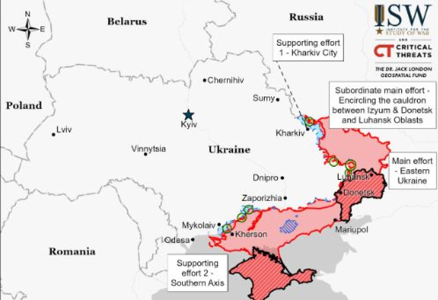 Оккупанты готовятся к одновременному наступлению на Славянск и Краматорск, — Институт изучения войныВойска российских оккупантов, вероятно, будут штурмовать Краматорск и Славянск в Донецкой области одновременно — наступление готовится сразу с трех сторон. Как сообщают аналитики Института изучения войны (ISW), российские нацисты добились незначительных успехов на юго-восток от Северска и продолжили наступательные действия на запад от Лисичанска. Оккупанты нанесли артиллерийские удары к югу от Барвенкова и обстреляли Никополь, Новопавловку и несколько населенных пунктов на северо-запад от Славянска. Эксперты считают, что эти удары могут свидетельствовать о том, что оккупанты стремятся обойти Барвенково с востока и либо двигаться в направлении шоссе E40 Изюм-Славянск для продвижения на юго-восток в сторону Славянска, либо — прямо на юго-восток от Барвенкова в сторону Краматорска. Не исключено, что путинские войска создают для себя условия, чтобы вести одновременное, параллельное наступление на Краматорск и Славянск. В институте также сообщили, что войска рф накануне проводили ограниченные попытки наступления и наносили воздушные, артиллерийские и ракетные удары по всей линии фронта. Сейчас россияне восстанавливают силы и создают условия для новых существенных наступлений в ближайшие недели или месяцы. Поэтому ожидать крупных наступательных операций от оккупантов не стоит. СМЕРТЬ РОСІЙСЬКИМ ОКУПАНТАМ! Помітили помилку? Виділяйте слова з помилкою та натискайте control-enter |