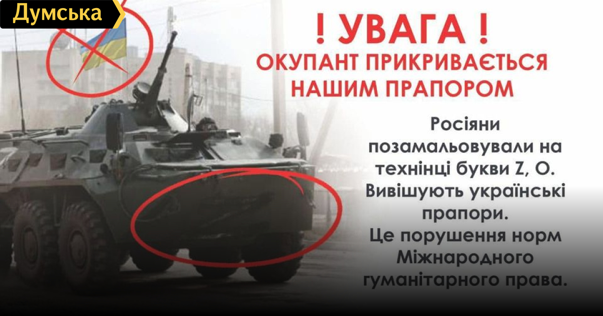 Оккупанты используют украинскую символику и вывешивают белые флаги перед огнем на поражениеОккупанты используют государственную символику Украины и вывешивают белые флаги на своей технике перед огнем на поражение. Украинские флаги вывешивают на колоннах российской военной техники, заявил главнокомандующий Вооруженными силами Валерий Залужный. Такие случаи замечены в населенных пунктах Победа, Новая Басань в Киевской области, на автодороге Красностав-Нежин Черниговской области. Кроме того, зафиксированы случаи, когда противник вывешивает белый флаг на своей технике якобы для того, чтобы сдаться. Однако, после приближения к украинским позициям, оккупанты начинают открывать огонь на поражение. Такие действия противника являются очередным подлым нарушением норм Международного гуманитарного права. СМЕРТЬ РОСІЙСЬКИМ ОКУПАНТАМ! Помітили помилку? Виділяйте слова з помилкою та натискайте control-enter |