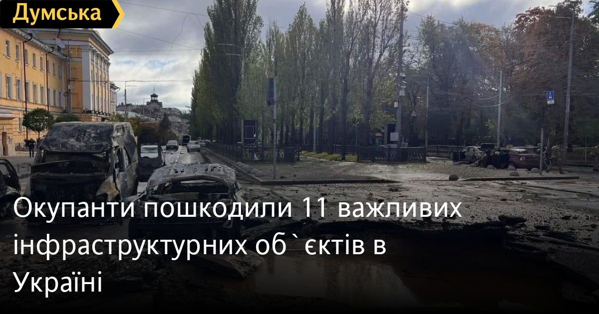 Окупанти пошкодили 11 важливих інфраструктурних об`єктів в Україні11 важливих інфраструктурних об’єктів у восьми регіонах країни і в місті Києві пошкоджено внаслідок ранкової атаки російських окупантів. Про це повідомив прем'єр-міністр України Денис Шмигаль. «Одними з перших цілей стали дитячий майданчик, музеї та освітні заклади. На жаль, загинули люди. Станом на 11:00 пошкоджено 11 важливих інфраструктурних об’єктів у 8 регіонах і місті Києві. Зараз частина областей знеструмлені», — підкреслив голова уряду. Він попередив, що українцям слід бути готовими до тимчасових перебоїв зі світлом, водопостачанням і зв'язком. «Головна мета цих воєнних злочинців посіяти паніку, налякати, залишити українців без світла й тепла. Всі служби працюють на місцях, ми оперативно відновлюємо нашу інфраструктуру. Зробимо все, аби якнайшвидше відновити всі об’єкти», — запевник Шмигаль. Він також подякував рятувальникам і медикам, які зараз в епіцентрах обстрілів рятують життя людей, і енергетикам, які під обстрілами відновлюють живлення міст. СМЕРТЬ РОСІЙСЬКИМ ОКУПАНТАМ! Помітили помилку? Виділяйте слова з помилкою та натискайте control-enter |