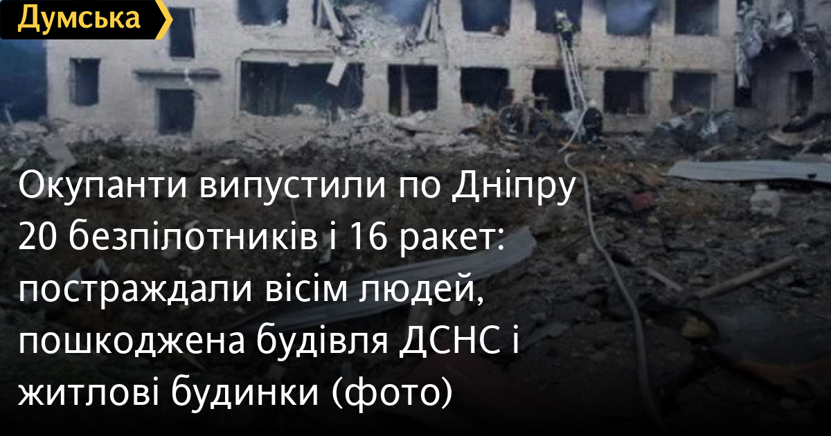 Окупанти випустили по Дніпру 20 безпілотників і 16 ракет: постраждали вісім людей, пошкоджена будівля ДСНС і житлові будинки🤬 675 😢 104 👍 27 ❤ 5 😁 2 16 ракет різних типів і 20 ударних безпілотників Shahed-136/131 випустили минулої ночі російські окупанти по Дніпру. Як повідомили в Повітряних силах, ворог вдарив по місту чотирма крилатими ракетами повітряного базування Х-101/Х-555 з стратегічних бомбардувальників Ту-95мс з району Каспійського моря. Також він випустив п'ять крилатих ракет Х-22 із дальніх бомбардувальників Ту-22м3 з різних напрямків –Азовського моря та Курської області; дві балістичні ракети «Іскандер-М» з окупованого Криму і п'ять зенітних керованих ракет С-300 з окупованої території Запорізької області. Сили і засоби протиповітряної оборони повітряного командування «Схід» та повітряного командування «Південь» знищили чотири крилаті ракети Х-101/Х-555 та 20 дронів Shahed. Проте, на жаль, є й прильоти. За словами керівника Дніпропетровської ОВА Сергія Лисака, у Дніпровському районі через ракетний удар поранений 27-річний чоловік. Він знаходиться у лікарні в стані середньої тяжкості. Також пошкоджені кілька будівель рятувального підрозділу. Виникло дві пожежі, які вже загасили. Знищені більш ніж десять вантажних та легкових авто, стільки ж одиниць спецтехніки – пошкоджені. Окрім того, побиті 25 приватних машин та два автобуси. Також є влучання по приватному підприємству у Дніпрі. Там понівечені три будівлі. В Іларіонівській громаді Синельниківського району впав безпілотник, а також там виявили уламки ракети. В результаті постраждали семеро людей, жінки 52-х та 70 років знаходятся у лікарні. Також зачепило три приватні будинки та дев'ять багатоквартирних, дитсадок, магазини та адмінбудівлі. СМЕРТЬ РОСІЙСЬКИМ ОКУПАНТАМ! Помітили помилку? Виділяйте слова з помилкою та натискайте control-enter |