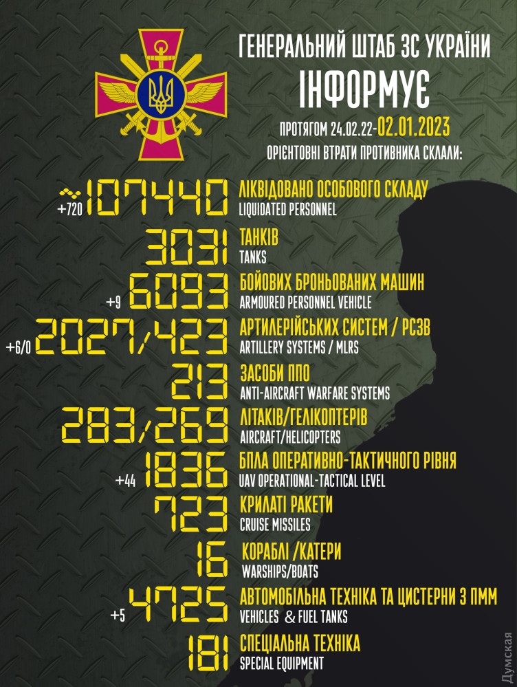 Окупанти за добу втратили 720 солдатів, шість артустановок і дев`ять бронемашинСили оборони України 1 січня знищили 720 ворожих солдатів і офіцерів. Від початку вторгнення рашисти втратили вже 107 440 військовослужбовців. За даними Генерального штабу Збройних сил України, наші воїни вчора знищили дев'ять бойових броньованих машин (6093 з 24 лютого), шість артилерійських систем (2027) і п'ять вантажівок (4725). ППО збила 44 ворожі безпілотники (1836). СМЕРТЬ РОСІЙСЬКИМ ОКУПАНТАМ! Помітили помилку? Виділяйте слова з помилкою та натискайте control-enter |