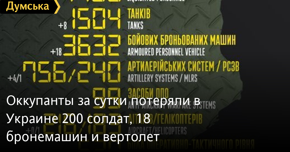 Силы обороны Украины продолжают уничтожать захватчиков, пришедших на нашу землю. Вчера российские войска уменьшились на 200 солдат и офицеров. По данным Генерального штаба Вооруженных сил Украины, наши защитники также сожгли восемь вражеских танков и 18 бронемашин, пять автомобилей, четыре артиллерийские системы и одну реактивную систему залпового огня. Сбит один вертолет противника и шесть беспилотников оперативно-тактического уровня. СМЕРТЬ РОССИЙСКИМ ОККУПАНТАМ! Заметили ошибку? Выделяйте слова с ошибкой и нажимайте control-enter |