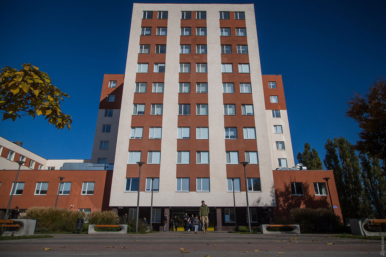 Так называемая «новая», она же Европейская мэрия, бывшее админздание завода «Краян», превращенное в образцовый хаб муниципального обслуживания. Правда, оно было приобретено городом за бюджетные средства совсем не по европейской схеме, что возбудило НАБУ и САП, открывших уголовное производство. Итак, «новая мэрия». Вылизанный фасад, уложенная с четвертого раза плитка, остановочные комплексы с бравурными сообщениями о достижениях городской власти