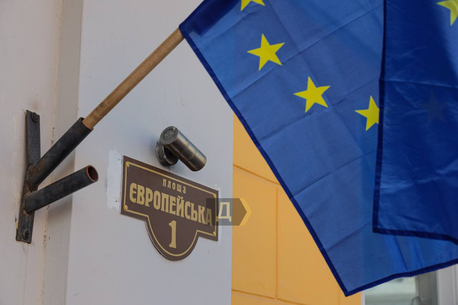 Першу адресну табличку встановили на будинку 1 на колишній Катерининській площі, перейменованій на Європейську.