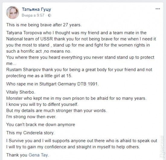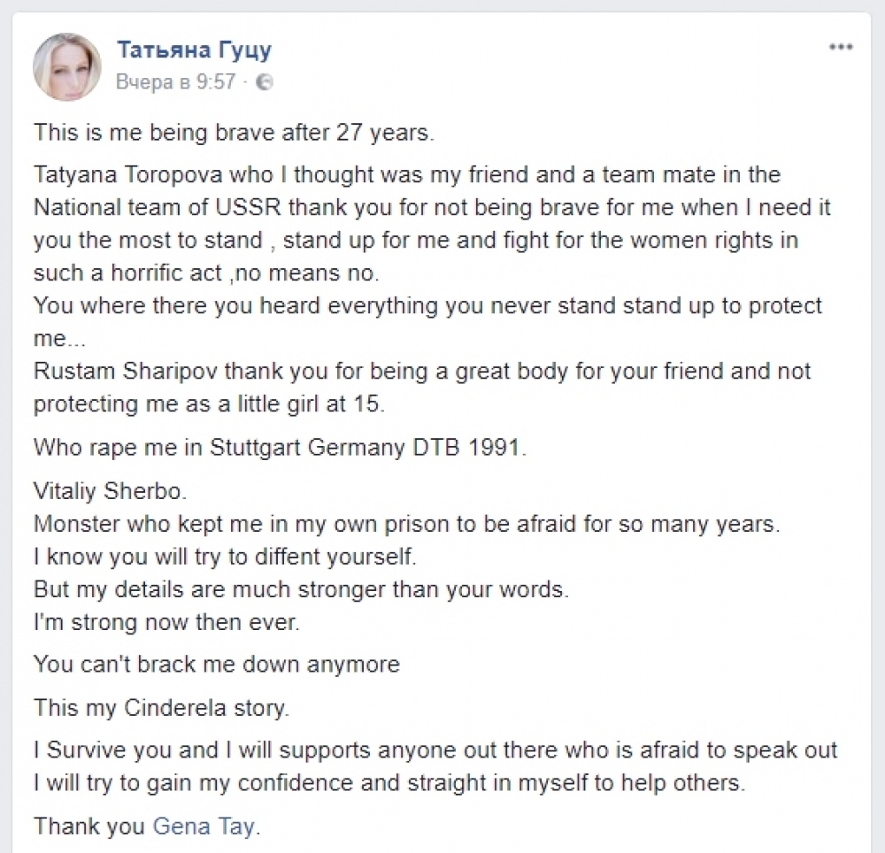«Тот, кто изнасиловал меня в немецком Штутгарте в 1991 году, – Виталий Щербо. Монстр, из-за которого я находилась в собственной клетке долгие годы. Я знаю, что ты попытаешься защитить себя. Но мои доказательства гораздо сильнее твоих слов. Сейчас я сильна как никогда. Ты больше не сможешь меня сломать. Это моя история Золушки. Я пережила это, и я буду поддерживать каждого, кто боится высказаться, я попытаюсь быть уверенной в своих силах и помогать другим», – призналась одесситка. Кроме того, Татьяна Гуцу «поблагодарила» других спортсменов из советской команды, которые не стали ей помогать в тот день.