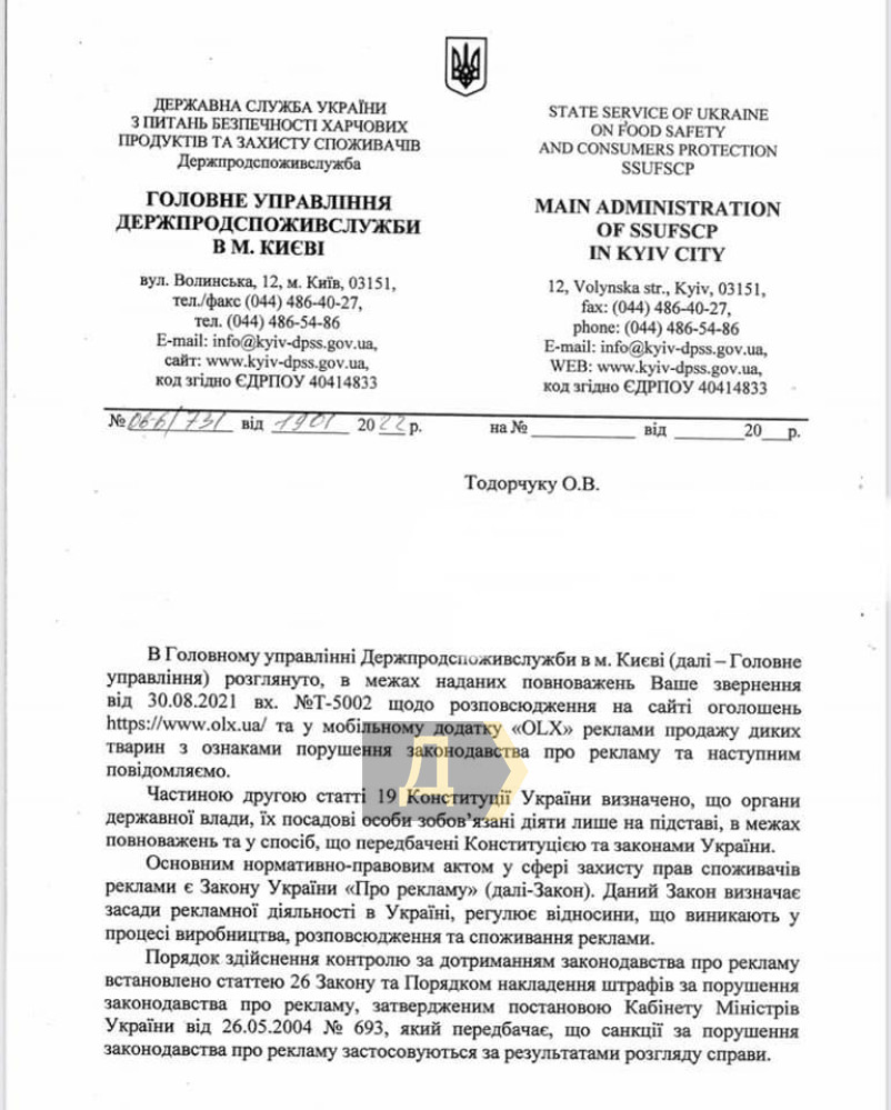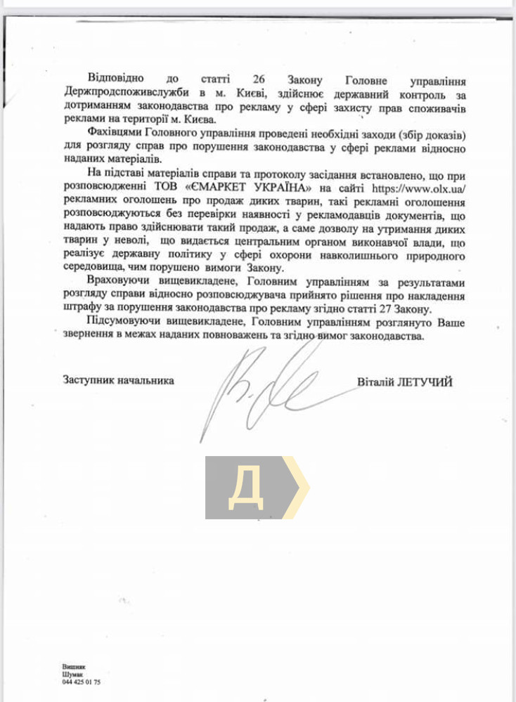 Госпродпотребслужба оштрафовала владельца сайта объявлений OLX за продажу диких животных. Об этом сообщает зоозащитная организация UAnimals, которая пожаловалась в службу на ресурс. Сообщается, что ООО «ЄМАРКЕТ УКРАЇНА» распространяло рекламные объявления на сайте olx.ua о продаже диких животных без проверки наличия у рекламодателей разрешения на их содержание в неволе. Сайтом OLX такие документы не проверялись и продажи производились бесконтрольно. По закону данное нарушение расценивается как жестокое обращение с животными, наносящее ущерб их безопасности и здоровью. Сумма штрафа в ответе Госпродпотребслужбы не уточняется. СМЕРТЬ РОССИЙСКИМ ОККУПАНТАМ! Заметили ошибку? Выделяйте слова с ошибкой и нажимайте control-enter |