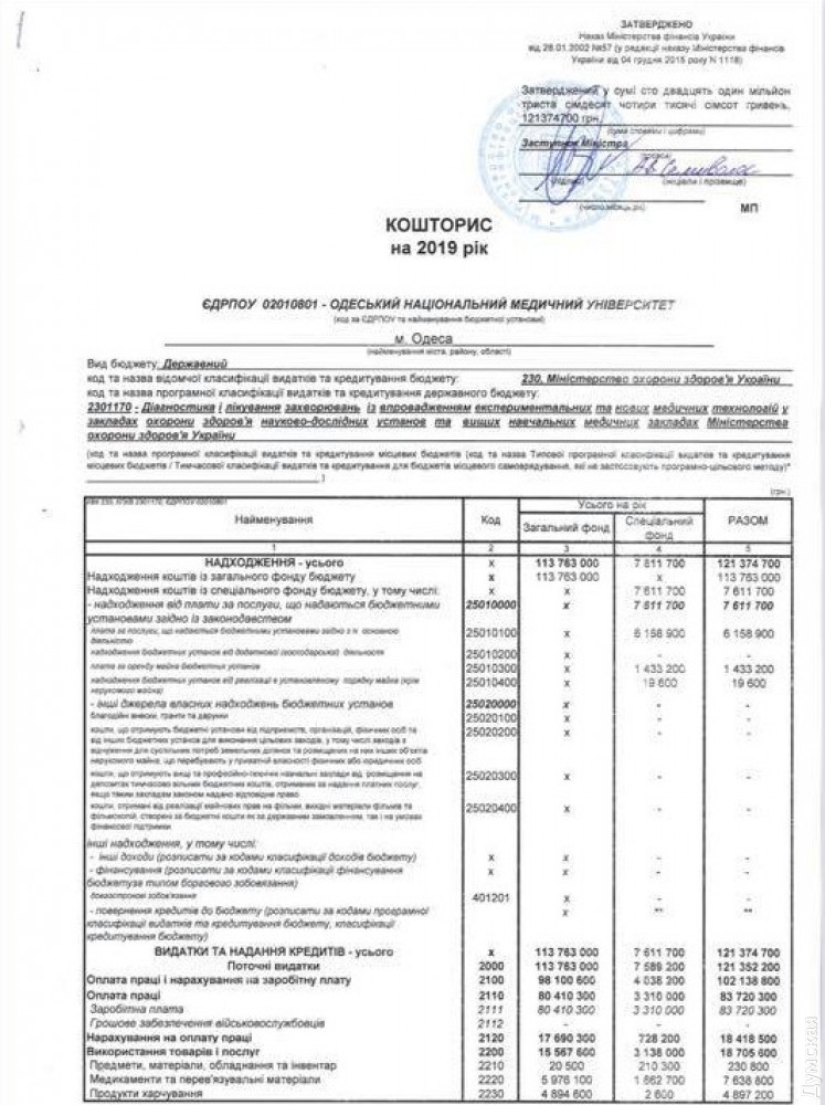 Минздрав подписал бюджет Одесского медуниверситета: с сотрудниками и студентами наконец рассчитаютсяМинистерство здравоохранения Украины пошло на уступки сторонникам бывшего ректора Одесского национального медицинского университета Валерия Запорожана. На днях первый заместитель главы ведомства Андрей Семиволос подписал бюджет вуза на 2019 год, поданный самозваным и.о. ректора Юрием Сухиным. В результате университет получит деньги на выплату зарплат и стипендий, которые задерживают уже полгода. Бюджет утвержден в размере 121 млн 374 тыс. 700 грн. На оплату труда пойдет 98 млн 100 тыс. 600 грн. Ранее в Минздраве заявляли, что подпишут только документ от законного и.о. ректора Константина Аймедова. СМЕРТЬ РОССИЙСКИМ ОККУПАНТАМ! Заметили ошибку? Выделяйте слова с ошибкой и нажимайте control-enter