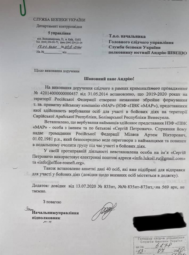 Все-таки измена? Парламентарий опубликовал новые документы по российским террористам, которых помешал захватить Офис президентаНовое развитие получило «дело вагнеровцев» — о государственной измене, которая, по всей видимости, была совершена кем-то из окружения президента Владимира Зеленского. Сегодня депутат Верховной Рады Украины от партии «Европейская Солидарность» Владимир Арьев обнародовал документы, подтверждающие тот факт, что украинские спецслужбы все-таки проводили операцию по поимке группы российских террористов. Операцию, которая была сорвана после совещания в кабинете главы государства. Руководители Главного управления Минобороны, СБУ и Офиса президента, напомним, утверждают, что никакой спецоперации не было и «вы все врете». Однако Арьев утверждает, что располагает полным пакетом доказательств, опровергнуть которые просто невозможно. «Сейчас будет длинный текст, но его стоит дочитать. А особенно посмотреть фото, видео и документы, чтобы понять всю глубину лжи власти и осознать, какую реальную измену совершили лица из окружения Зеленского, — заявил политик. — Уже все знают об истории с «вагнеровцами». СМИ писали о сливе спецоперации Офисом президента. Ее суть, как описал Юрий Бутусов (главный редактор издания «Цензор.НЕТ», — Ред.), — выманивание из России боевиков, причастных к российской агрессии на Донбассе в 2014-16 годах, для последующего ареста в Украине. Это делалось под видом вербовки для работы в Венесуэле и Сирии. Янина Соколова (журналист «5 канала», — Ред.) выставила переговоры с боевиками вербовщика, оперативника наших спецслужб. В частности, разговор с боевиком Харитоновым, который был членом диверсионной группы, на счету которой — сбитые украинские воздушные суда». «Власть отрицала существование такой спецоперации и назвала ее фейком, — продолжает Арьев. — Я утверждаю: власть врет. Далее — неопровержимые доказательства». В частности, он обнародовал письмо начальника пятого управления департамента контрразведки СБУ, датированное 13 июля 2020 г. Контрразведчик информирует руководителя главного следственного управления ведомства, что в 2019-20 годах в рамках уголовного производства, которое расследуется с мая 2014 года в связи с вооруженной агрессией РФ против Украины, было установлено, что на территории России создается новое незаконное вооруженное формирование. Его сколачивает человек, который представляется Сергеем Петровичем. На самом деле, это был оперативник украинских спецслужб (об этом в документе нет ни слова, но в бумагах, не имеющих грифа «секретно», такая информация никогда и не указывается). «Сергей Петрович» установил анкетные данные и опросил сорок человек, которые были готовы отправиться в Венесуэлу и Сирию. Кроме того, он собрал у них свидетельства о преступлениях, совершенных в Украине. В «папке Арьева» есть также протокол осмотра носителей информации от 25 июля 2020 г., осуществленного в рамках этого уголовного производства. Документ подписан следователем СБУ, содержит фамилии «вагнеровцев», чьи личные данные и разговоры с которыми были на этих носителях информации. Подпись следователя СБУ стоит и на расшифровках разговоров россиян с вербовщиком. Например, под протоколом беседы с Харитоновым, аудиозапись которой ранее обнародовала Янина Соколова. Российские боевики должны