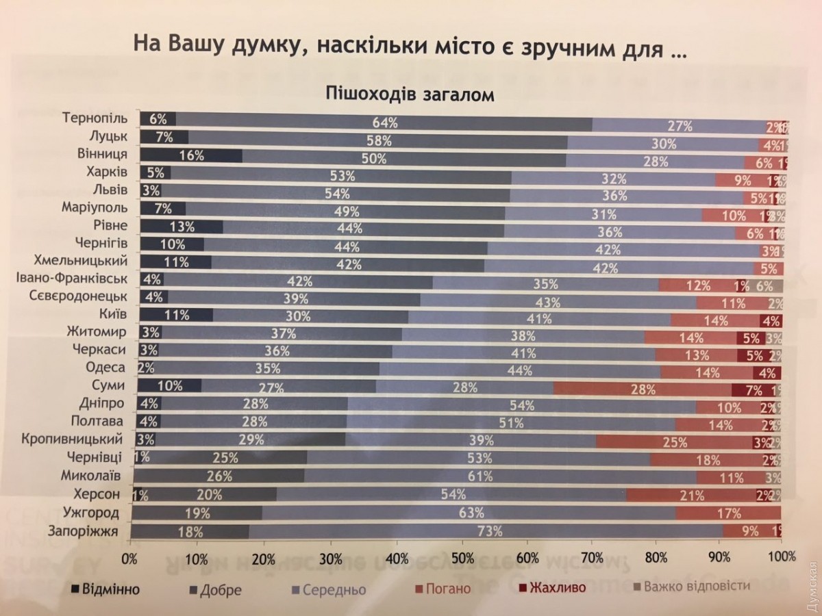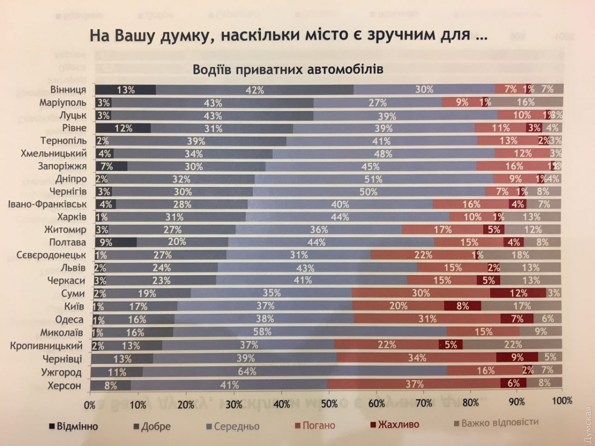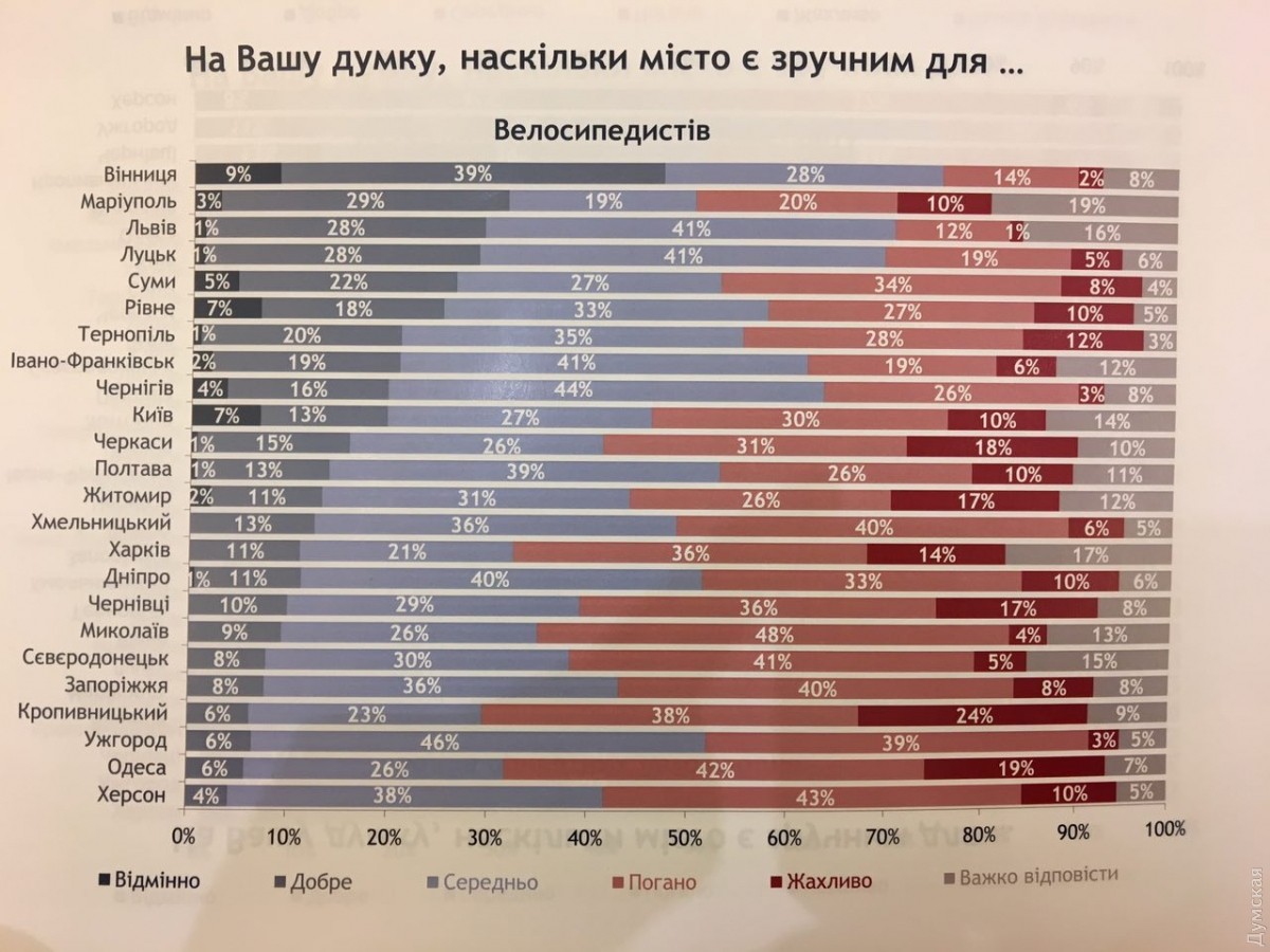 Только 4% опрошенных выставили оценку «хорошо», в то же время 42% считают, что «плохо», а 19% - «ужасно». Лидируют в рейтинге самых «велосипедных» городов Винница, Мариуполь и Львов.