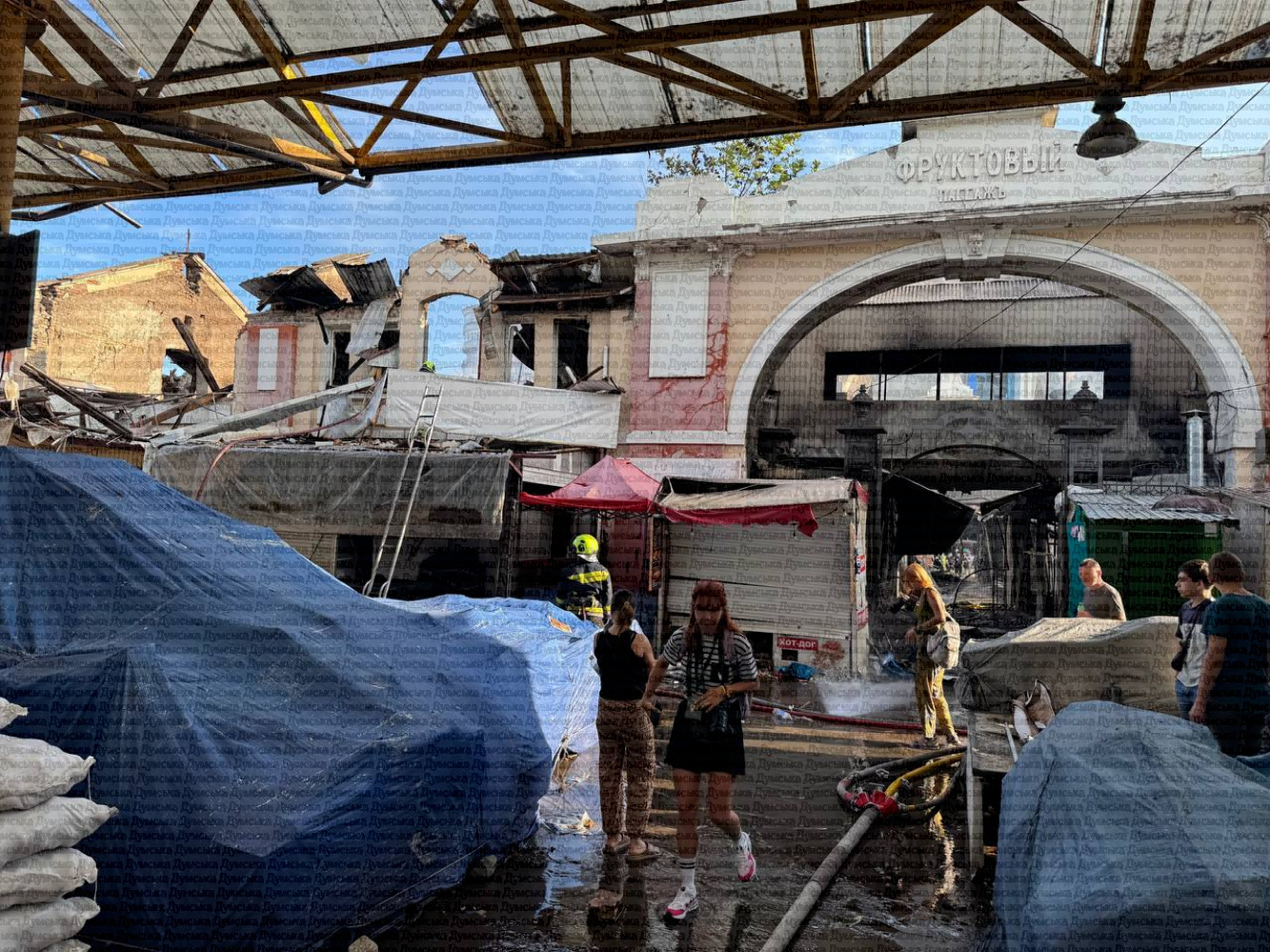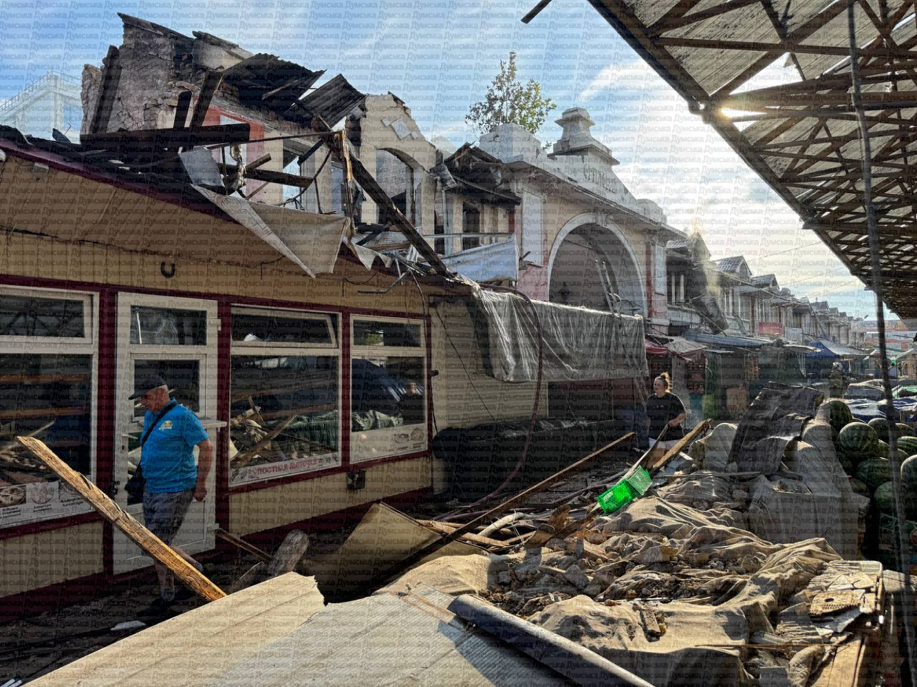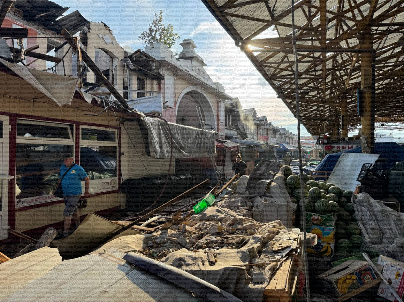 Як передає кореспондент «Думської», зруйновано історичні будівлі фруктового павільйону, уламки дронів лежать серед торгових рядів. Люди рятують уцілілий товар.