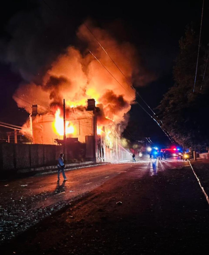 В этом помещении был пожар вследствие атаки. Спасатели до сих пор проливают.