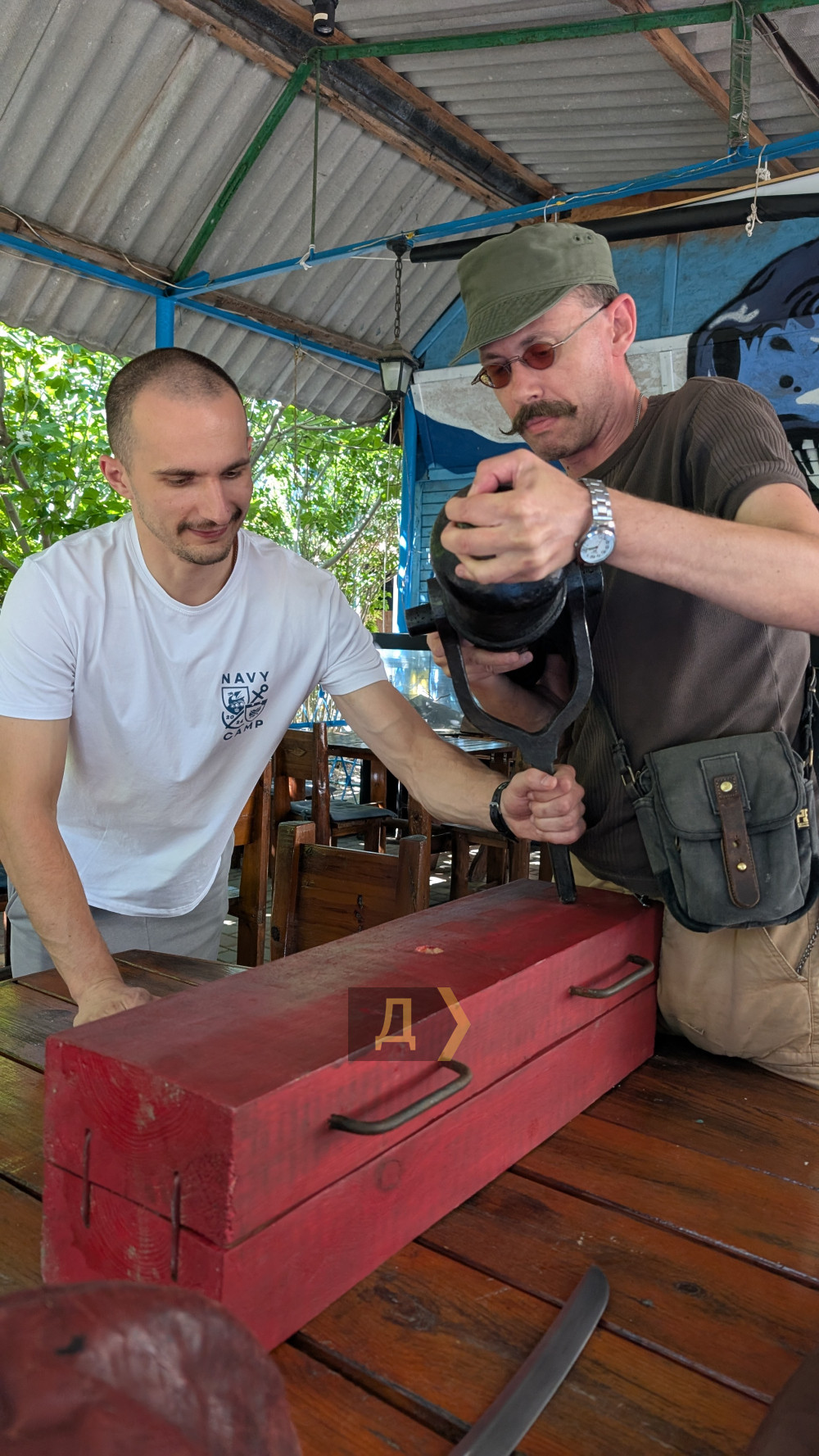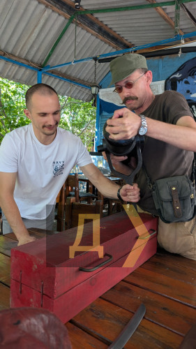 Не думайте, що лекції тут – це монотонні розповіді про те, що було, коли земля була ще холодною. Де ще ви зможете побачити справжню гармату XVIII ст. Цей фальконет можна розглянути, доторкнутися, відчути вагу металу. «Це така морська легка артилерія, але її могли переставляти на дерев'яні станини та використовувати на суходолі. В опису загону, який ішов штурмувати Хаджибей є шість полків Чорноморських козаків — три піхотні, три кінні та батарея з шести таких легких гармат», — пояснює реконструктор Олег Ровнер. Зліва направо: Олександр Косюра та Олег Ровнер Разом із цим артефактом привезли й інші матеріальні свідчення епохи. 39-та бригада зберігає традиції предків, і серце на емблемі, вже менш тривожне, нагадує про те, що всі ми, «браття, козацького роду». Авторка — редакторка «Думської» Алія Замчінська СМЕРТЬ РОСІЙСЬКИМ ОКУПАНТАМ! Помітили помилку? Виділяйте слова з помилкою та натискайте control-enter |