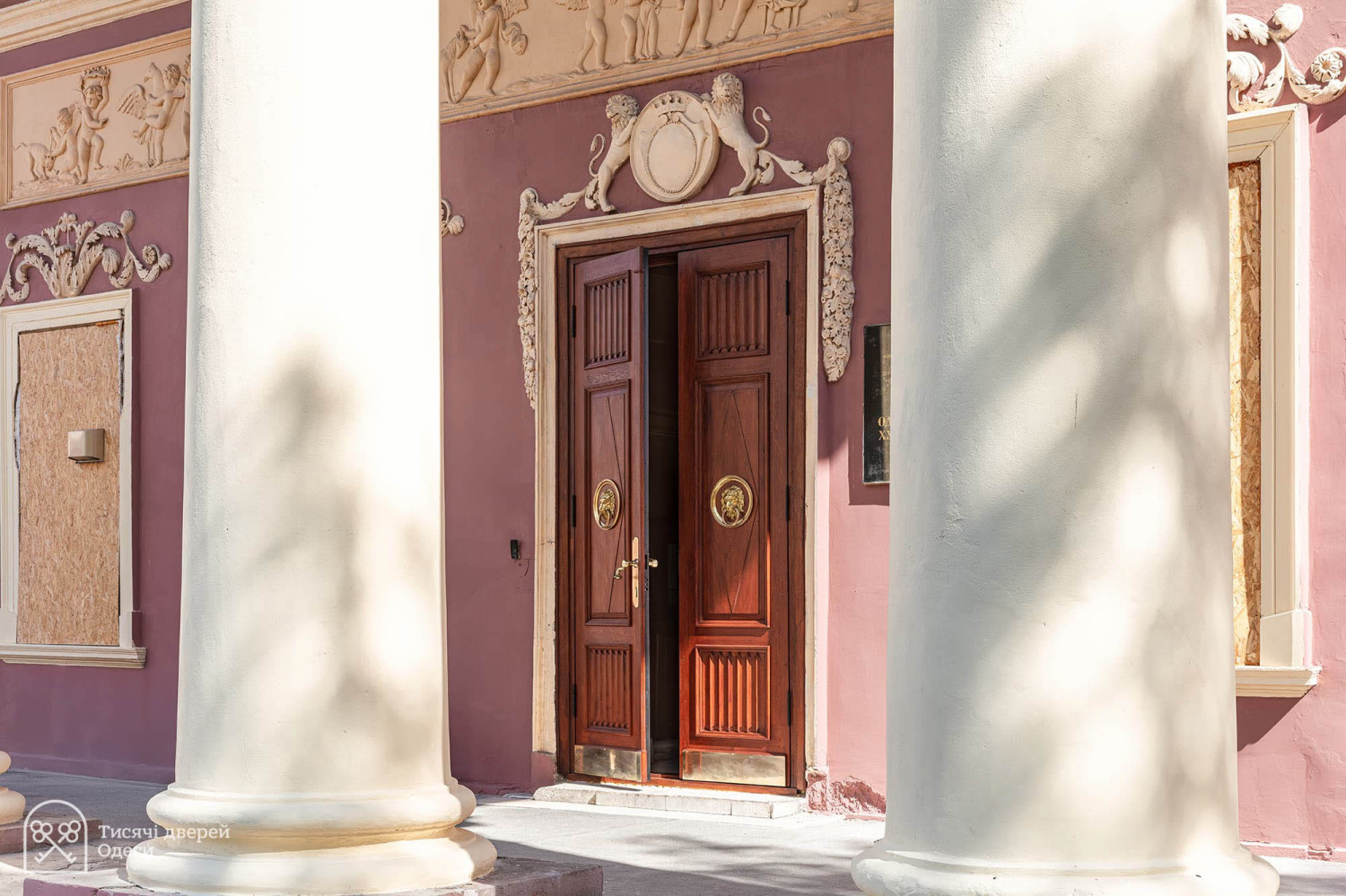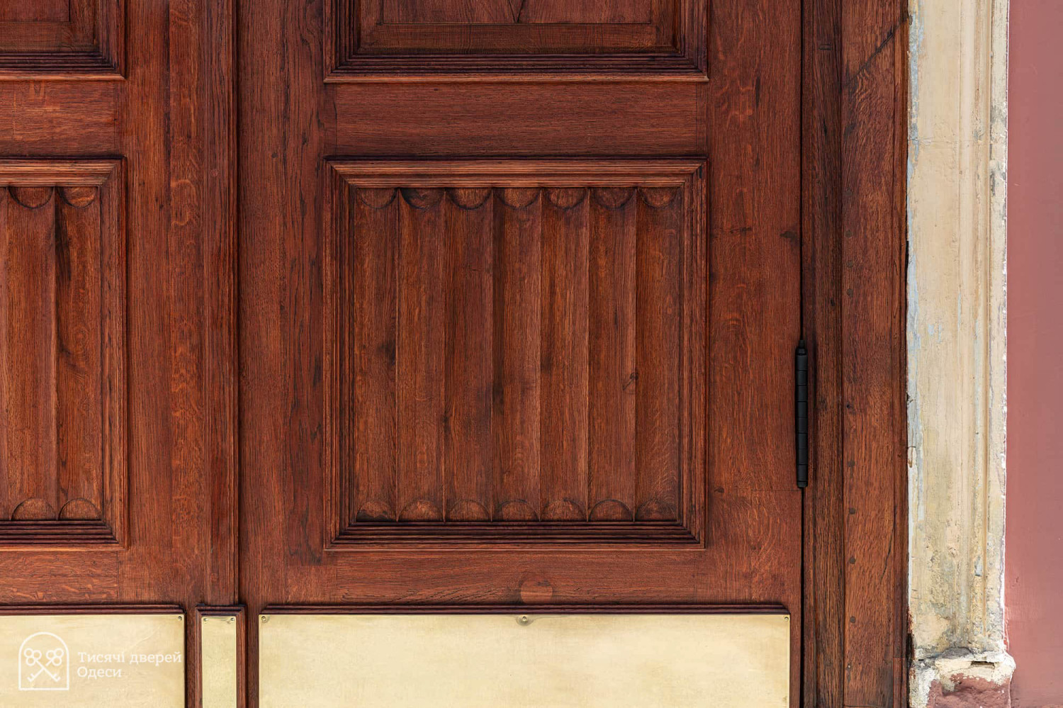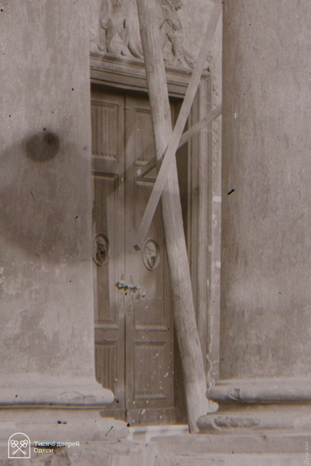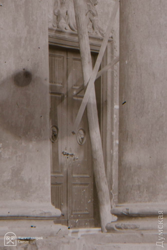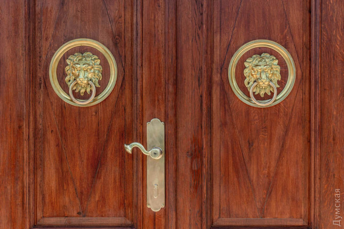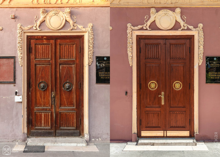 Дубові двері парадного входу до Одеського художнього музею відреставрувала команда проєкту «Тисячі дверей Одеси». Як розповів «Думській» керівник проєкту, урбаніст Олександр Левицький, на відновлення дверей пішло трохи більше двох місяців, а реставрації передувала робота з архівними фотографіями. У листопаді 2023 року Палац Потоцького на Софійській вулиці постраждав від ворожого обстрілу — російська ракета впала за кілька десятків метрів від пам'ятки архітектури національного значення. Вибухова хвиля та осколки побили фасад, вирвали віконні рами та посікли двері. «Двері відремонтували після пошкодження від вибуху і, якщо чесно, було б краще, якби ми їх одразу тоді взяли — косметичний ремонт ускладнив нам роботу, — розповів Олександр Левицький. — Один із найскладніших моментів полягав у тому, що це двері з пам'ятки архітектури національного значення. Потрібно було покопатися в архівах. Музей люб'язно надав нам фотоматеріали, які допомогли відтворити втрачені або змінені деталі. Ми змогли ідентифікувати зовнішній вигляд притворної планки та повернути її на місце». Архівна фотографія дверей За словами реставратора, за два століття свого існування (палац був побудований на зорі ХІХ століття) двері зазнали кількох значущих втрат. Спочатку латунних ручок було дві - на кожній зі стулок. До наших часів збереглася тільки одна. Крім того, колись двері відчинялися всередину будівлі. За радянських часів, найімовірніше, через вимоги пожежної безпеки, петлі перевісили, і двері стали відчинятися назовні. Новоділом виявилися декоративні ромби на внутрішній частині дверей. Їх зробили з фанери, якої в ХІХ столітті, звісно ж, не було, і, щоб відновити автентичний вигляд, їх демонтували.
