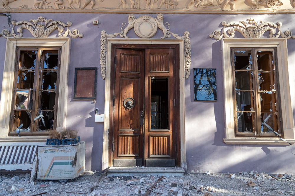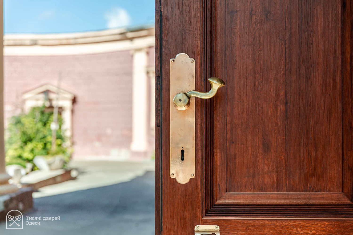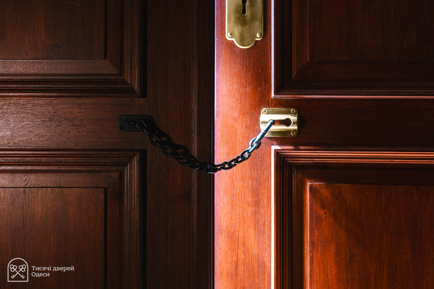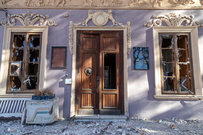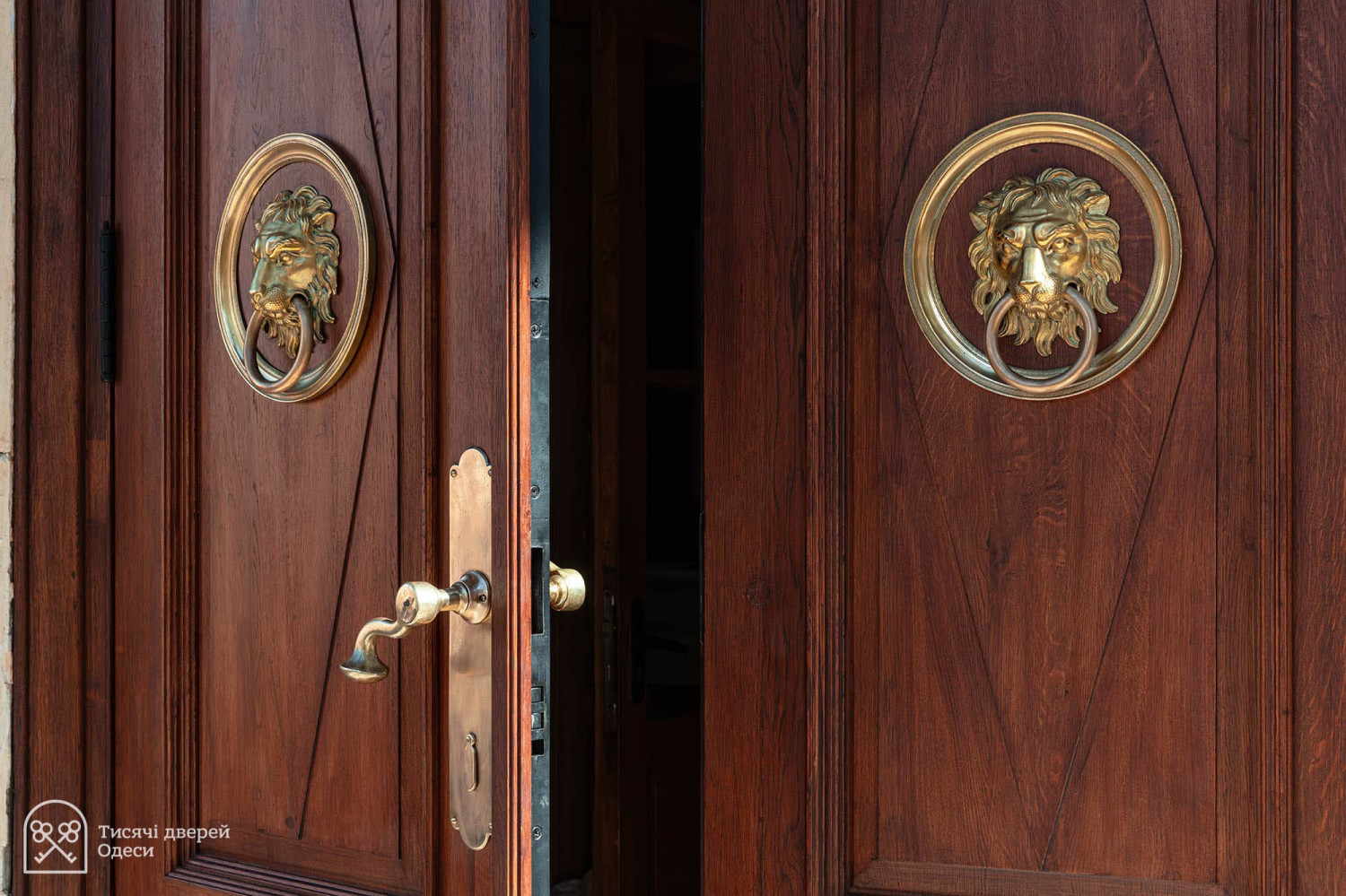 Дубові двері парадного входу до Одеського художнього музею відреставрувала команда проєкту «Тисячі дверей Одеси». Як розповів «Думській» керівник проєкту, урбаніст Олександр Левицький, на відновлення дверей пішло трохи більше двох місяців, а реставрації передувала робота з архівними фотографіями. У листопаді 2023 року Палац Потоцького на Софійській вулиці постраждав від ворожого обстрілу — російська ракета впала за кілька десятків метрів від пам'ятки архітектури національного значення. Вибухова хвиля та осколки побили фасад, вирвали віконні рами та посікли двері. «Двері відремонтували після пошкодження від вибуху і, якщо чесно, було б краще, якби ми їх одразу тоді взяли — косметичний ремонт ускладнив нам роботу, — розповів Олександр Левицький. — Один із найскладніших моментів полягав у тому, що це двері з пам'ятки архітектури національного значення. Потрібно було покопатися в архівах. Музей люб'язно надав нам фотоматеріали, які допомогли відтворити втрачені або змінені деталі. Ми змогли ідентифікувати зовнішній вигляд притворної планки та повернути її на місце». Архівна фотографія дверей За словами реставратора, за два століття свого існування (палац був побудований на зорі ХІХ століття) двері зазнали кількох значущих втрат. Спочатку латунних ручок було дві - на кожній зі стулок. До наших часів збереглася тільки одна. Крім того, колись двері відчинялися всередину будівлі. За радянських часів, найімовірніше, через вимоги пожежної безпеки, петлі перевісили, і двері стали відчинятися назовні. Новоділом виявилися декоративні ромби на внутрішній частині дверей. Їх зробили з фанери, якої в ХІХ столітті, звісно ж, не було, і, щоб відновити автентичний вигляд, їх демонтували.