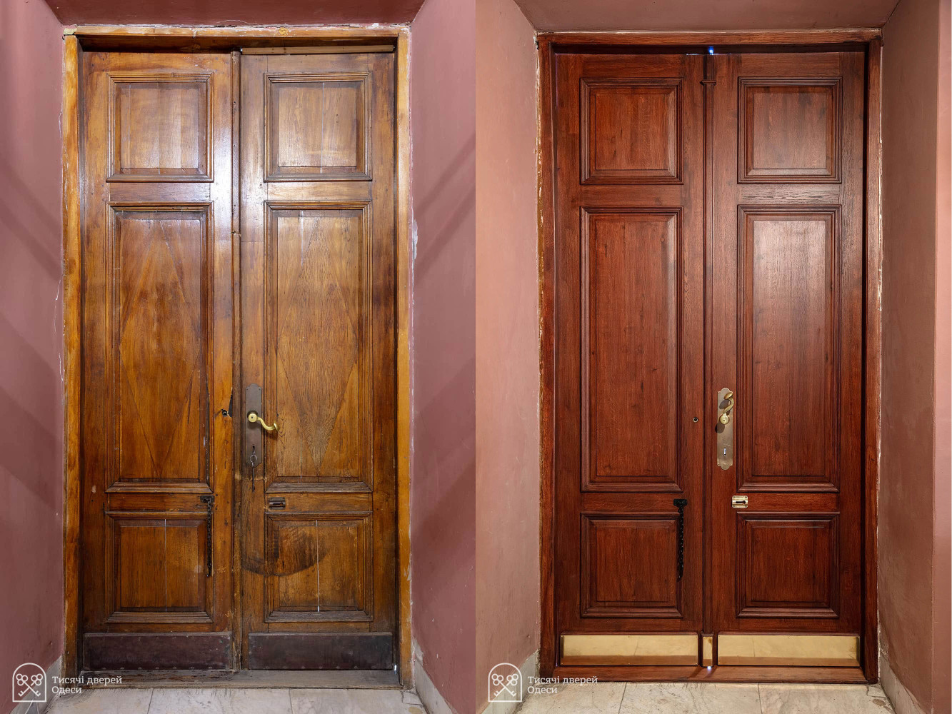 Реставратори Андрій Сорокін і Сергій Ємельянов не лише усунули численні пошкодження на дверному полотні та повернули справжній вигляд декоративним фільонкам, а й вдихнули друге життя в усі металеві деталі: оригінальний механічний замок, шпінгалети, латунні накладки та маскарони левів, які слугували дверними молотками. «Кожні двері, які ми беремо в роботу, відкривають для нас щось нове в технологіях наших предків, ми постійно вчимося, — розповів Олександр Левицький. — У цих дверях дуже незвичний шпінгалет, колись він відчинявся спеціальним ключем, який був загублений. Ми зробили цей ключ і він дає змогу цей шпінгалет відкривати одним простим рухом. Раніше доводилося користуватися зубилом і молотком, щоб відкривати неактивну стулку дверей». На фінальному етапі реставратори вкрили двері лазур'ю кольору махагон і просочили олією, щоб підкреслити текстуру деревини. СМЕРТЬ РОСІЙСЬКИМ ОКУПАНТАМ!