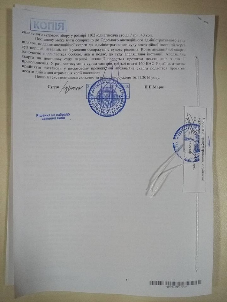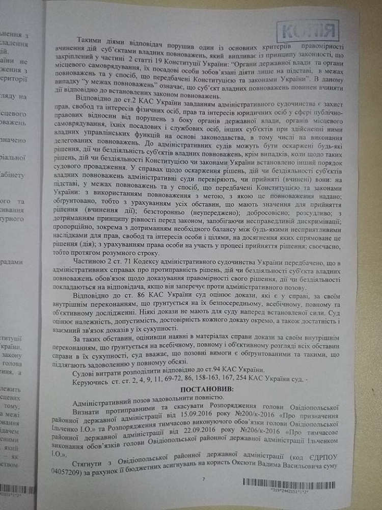 Руководитель Овидиопольской РГА назначил себя сам: суд отменил незаконные распоряженияАдминистративный суд Одесской области отменил распоряжение главы Овидиопольской райгосадминистрации Игоря Литвинюка о назначении Игоря Ильченко своим первым заместителем. Соответствующее решение суда опубликовал юрист Вадим Оксюта. В документе отмечается, что Литвинюк еще 28 июля 2016 года был уволен с должности Президентом Украины, поэтому 15 сентября, когда было подписано распоряжение о назначении Ильченко, он уже не был главой РГА и не имел полномочий назначать заместителей. Овидиопольский районный совет, напомним, проголосовал за недоверие Игорю Литвинюку, которого считают креатурой экс-вице-губернатора Владимира Жмака, еще 29 января текущего года. Данное решение набрало 21 голос из 36, то есть за отставку проголосовали больше половины, но меньше двух третей от общего числа депутатов. В результате ситуация «зависла» на полгода, и губернатор подал представление об отставке Литвинюка только после увольнения Жмака — 15 июля 2016 года. 28 июля Петр Порошенко своим распоряжением наконец уволил Литвинюка. Однако уходить с должности бывший глава РГА явно не собирался. Вначале Литвинюк был на больничном, а 25 августа с помощью титушек вернулся в свой кабинет и продолжил подписывать официальные документы. Одним из таких документов стало распоряжение о назначении его первым заместителем 25-летнего Игоря Ильченко, которое было подписано 15 сентября 2016 года. Еще через пять дней Михаил Саакашвили своим распоряжением «сообщил» о президентском решении и уволил Литвинюка. Обязанности председателя РГА с тех пор исполняет Игорь Ильченко. Изучая материалы дела, судья Петр Марин отметил, что назначает и увольняет глав районных администраций исключительно Президент Украины, и его распоряжения не требуют каких-либо дополнительных «сообщений», «утверждений» и тем более «уточнения даты». А это значит, что полномочия Литвинюка как главы РГА закончились еще 15 июля 2016 года, а «дополнительное» распоряжение Саакашвили о его увольнении принято с превышением полномочий и является незаконным. Суд отменил распоряжение Литвинюка 15 сентября о назначении Игоря Ильченко заместителем, а также подписанное Ильченко распоряжение от 22 сентября, которым он назначил себя исполняющим обязанности главы РГА. По мнению суда, Литвинюк фактически присвоил властные полномочия, а Ильченко превысил власть: назначение и.о. находится в компетенции Кабмина и Президента. К слову, адвокат Вадим Оксюта, который является истцом по данному делу, настойчиво претендует на должности в государственных органах. В частности, в прошлом году он участвовал в конкурсе на должность Ильчевского местного прокурора. Тогда занял первое место по результатам объективного тестирования и вошел в тройку претендентов, но прокурором так и не стал. В 2016 году он участвовал в конкурсе на должность первого заместителя главы Овидиопольской РГА, в котором уступил Игорю Ильченко (17,2 против 17,6 баллов). Оксюта обжаловал результаты конкурса, а также распоряжение о назначении Ильченко. Если решение судьи Марина вступит в законную силу, Овидиопольский район снова будет обезглавлен: Ильченко лишится должности заместителя и перестанет быть исполняющим обязанности главы РГА. СМЕРТЬ РОСІЙСЬКИМ ОКУПАНТАМ! Помітили п
