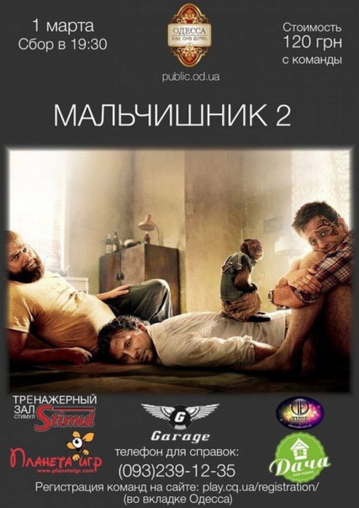 В Одессе пройдет автоквест по мотивам фильма «Мальчишник в Вегасе-2» (на правах рекламы)В субботу, 1 марта, в Одессе пройдет автоквест на тему популярной американской кинокомедии «Мальчишник в Вегасе-2». Как сообщают организаторы, игра рассчитана на новичков. Сбор участников — на Куликовом поле в 19:30. К участию допускаются команды, в составе которых – не более пяти человек. «Сити Квест – командная развлекательная игра в реальном мире, во время которой ваша команда будет решать загадки, перемещаться по городу и выполнять разные задания. Автоквест изменит все представления о ночных развлечениях», — говорится в анонсе. С собой нужно иметь: автомобиль, телефон с интернетом, письменные принадлежности, фонарики, карту города, фотоаппарат, логику и хорошее настроение. Также в игре поможет знание старых названий улиц и скверов. «Победители для улучшения своей физической формы и для взятия новых побед получат месячные безлимитные абонементы в новый тренажерный зал «STIMUL», — обещают организаторы. Зарегистрироваться на игру можно здесь. Для тех, кто играет впервые, здесь. По всем вопросам также можно звонить по телефону 0932391235. СМЕРТЬ РОСІЙСЬКИМ ОКУПАНТАМ! Помітили помилку? Виділяйте слова з помилкою та натискайте control-enter |