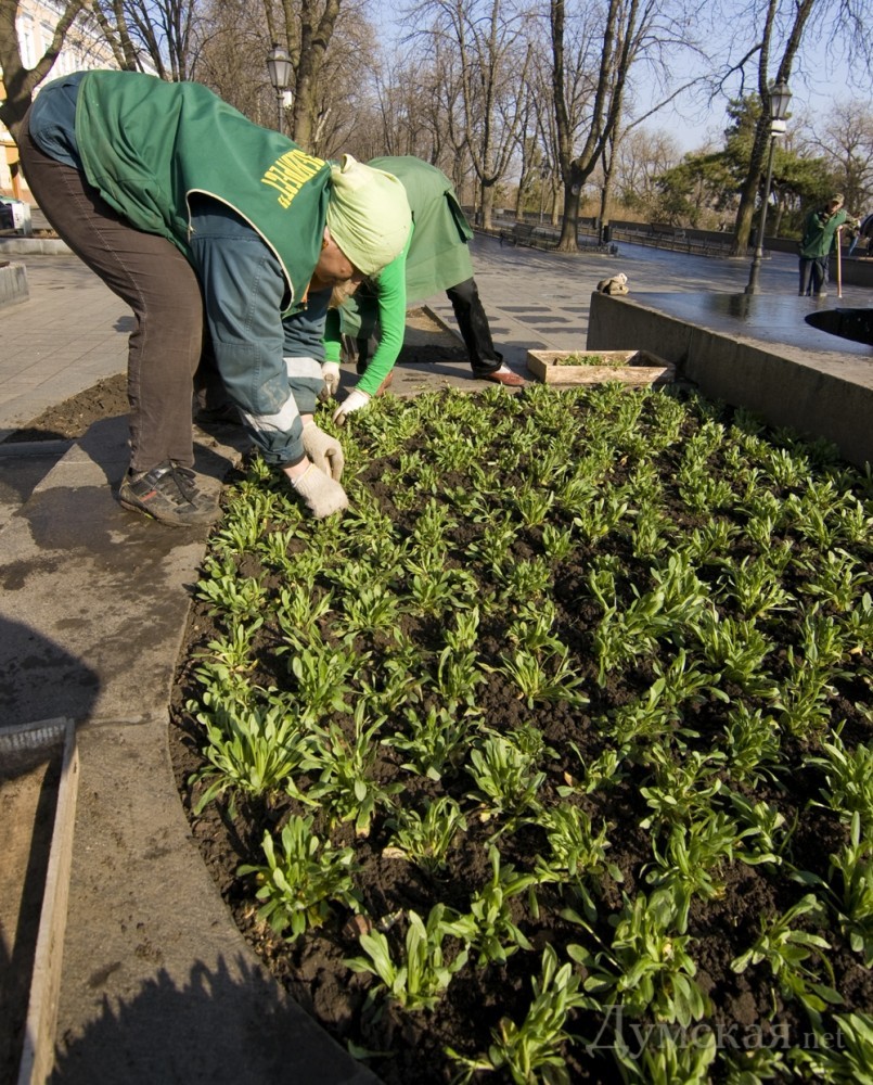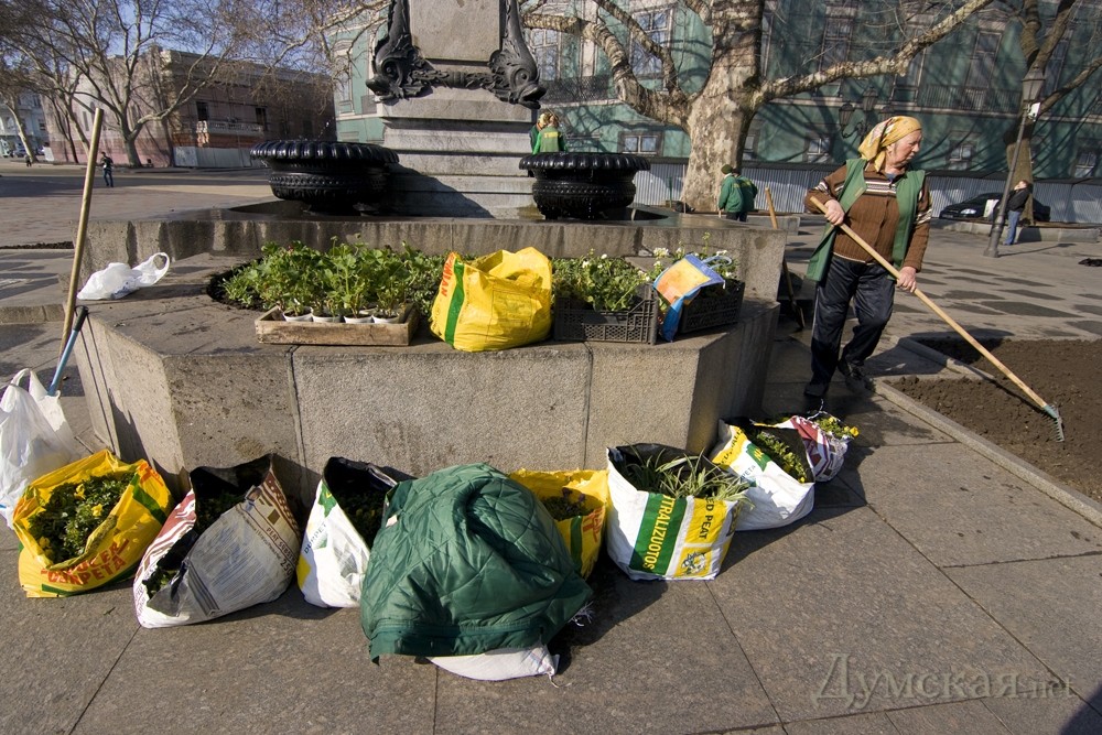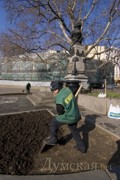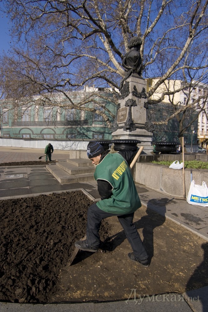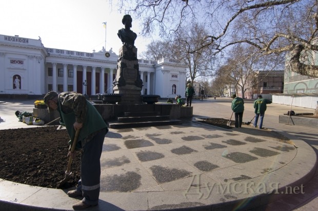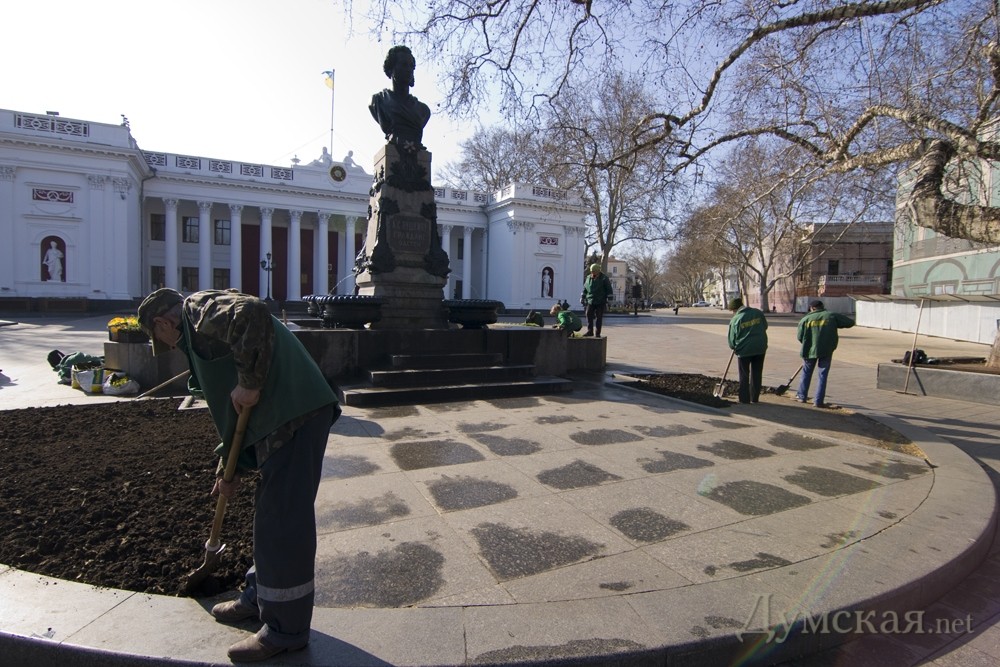 В Одессе приводят в порядок участок вокруг памятника Пушкину на Приморском бульваре. Сегодня сотрудники «Зелентреста» высаживали возле монумента незабудки, герань и фиалки.