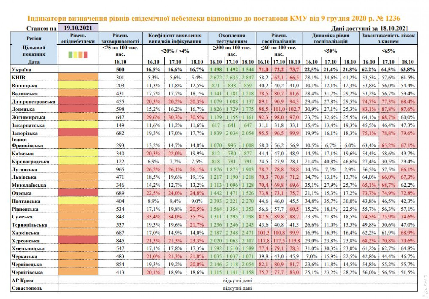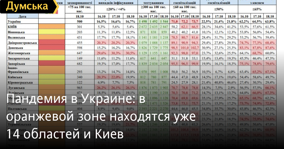 По состоянию на 19 октября 14 областей и Киев соответствуют оранжевой зоне по уровню эпидемической опасности распространения COVID-19. Как отмечают в МОЗ, в красной зоне остаются пять регионов — Днепропетровская, Донецкая, Запорожская, Одесская и Херсонская области. Оранжевые — Волынская, Житомирская, Ивано-Франковская, Тернопольская, Луганская, Львовская, Николаевская, Сумская, Харьковская, Хмельницкая, Черкасская, Черновицкая, Черниговская, Ровенская области и столица. В желтой зоне все еще расположены Винницкая, Закарпатская, Киевская, Кировоградская и Полтавская области. Зеленых зон в стране не осталось. Напомним, с 18 октября красную зону, помимо Херсонской области, пополнили четыре региона Украины. СМЕРТЬ РОССИЙСКИМ ОККУПАНТАМ! Заметили ошибку? Выделяйте слова с ошибкой и нажимайте control-enter |